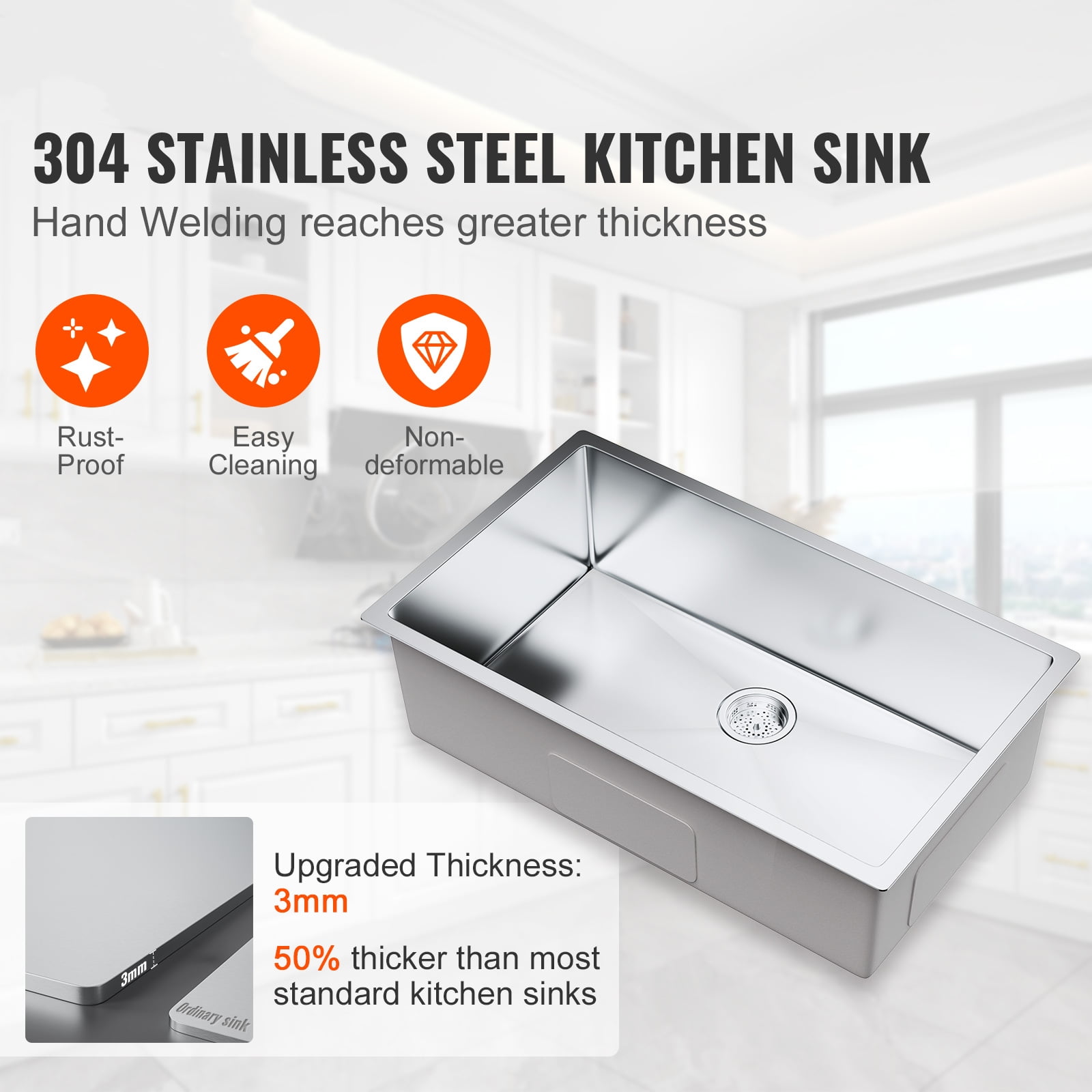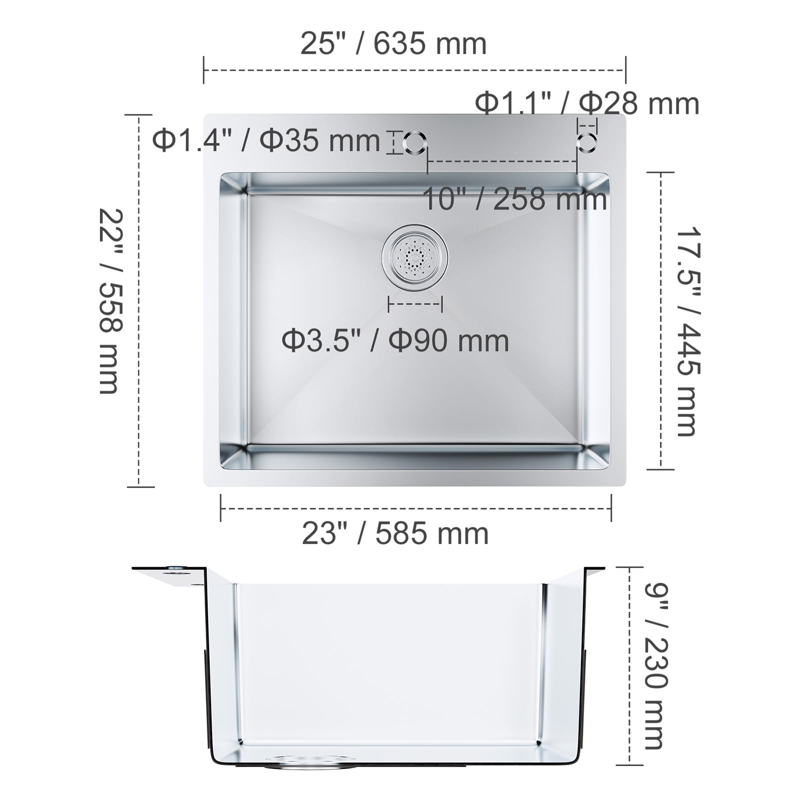 Heavy Duty Stainless Steel: This kitchen sink is crafted of high-quality 304 stainless steel, which is strong, durable, rust-resistant, and easy to clean. Upgraded Thickness: 3mm, which is 50% thicker than most standard kitchen sinks. Sink Dimensions: Exterior Dimensions: 25″ x 22″. Internal Dimensions: 23″ x 17.5″. Bowl Depth: 9″. This stainless steel drop-in sink is quite deep and not only fits those big pots/pans/cookie sheets, it hides the dirty dishes waiting to go into the dishwasher from view. Topmount Way: Topmount sink works with any style of countertop material. It can be easily installed and removed without damaging countertops. Humanized Design: This household dishwasher sink is ultra quiet with thicker & softer rubber noise reduction pads. X-shape flow line to avoid clogging. Features R10° rounded corners for easy cleanup and modern aesthetic. What You Will Get: Stainless drop in kitchen sink, a deep drain basket keeps food from clogging the drain pipe.