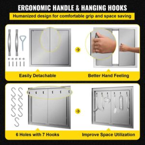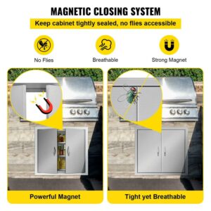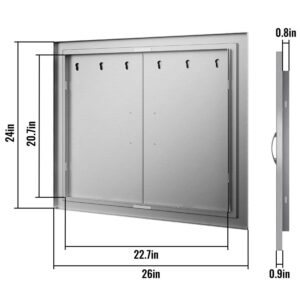 – Double-Wall Construction: Overall Dimensions (W x H): 26″ x 24″/66 x 61 cm; Cutout Dimensions (W x H): 22.7″ x 20.7″/57.7 x 52.6 cm. The outdoor kitchen doors, constructed with 304 stainless steel, feature corrosion and abrasion resistance. The double-layer door with a seamless design is more durable than a single-layer one. The brushed surface makes the door appealing, and it is easy to clean with no marks or smudges left.