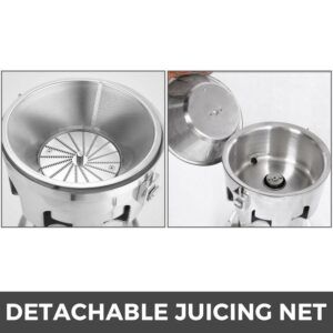 – CONVENIENT CLEANING – Stainless steel juicing net inside the juice extractor. 80° scientific blade tooth won’t let fiber remain easily. Net can be easily taken off with attached tool for convenient cleaning.
