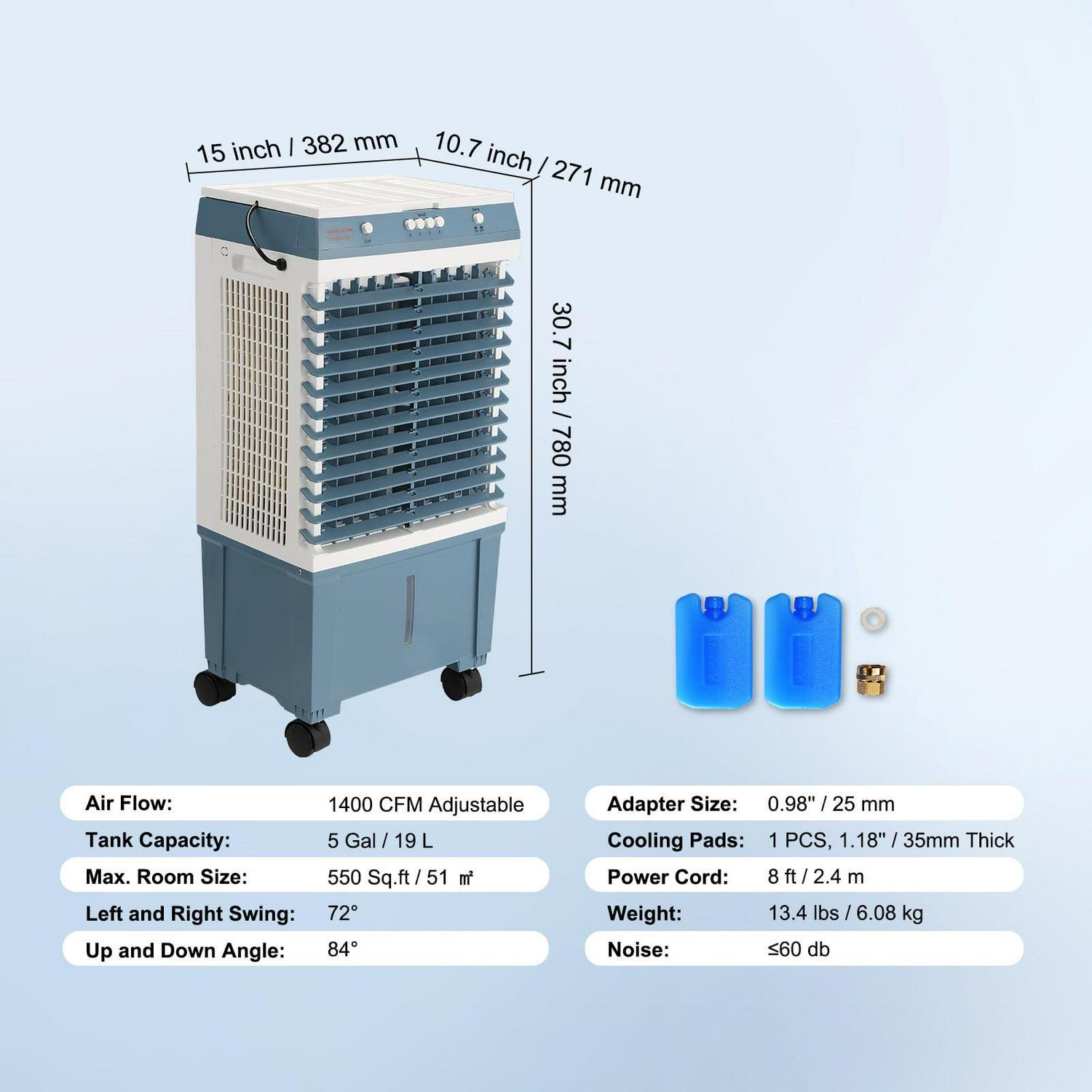 – Oscillation & Adjustable Airflow: This portable swamp cooler can easily cover a room of about 550 sq. ft. with its adjustable airflow of up to 1400 CFM. You can manually adjust the vertical angle of the louvers for maximum comfort and it can also automatically swing horizontally from 0° to 72°, ensuring that you can feel the cool breeze from any corner of the room.