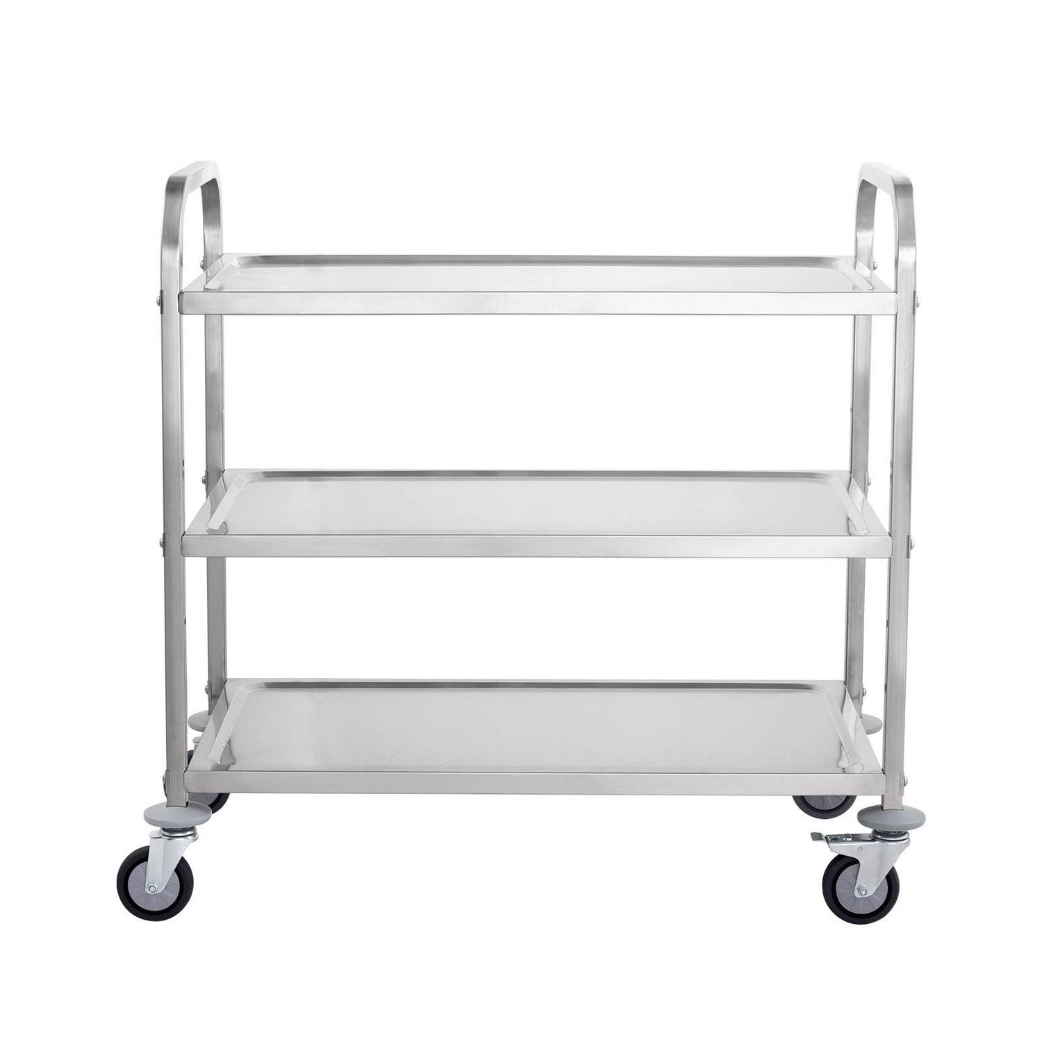 This 3-tier trolley can hold up to 450 pounds of heavy objects, and can hang various kitchen items with 6 additional hooks. Large household appliances can also be easily stored thanks to the freely-adjustable shelves. Wheels with silent brake are added to the bottom. You can transport various items to the place you need and then lock it. It is perfect for kitchen, restaurant, hotel and outdoor use.