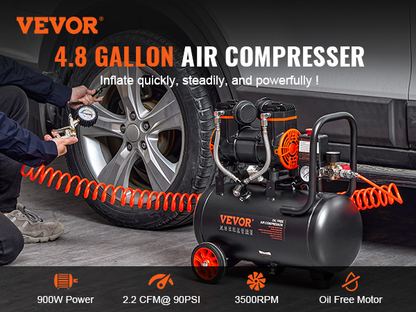 ” Product Description 4.8 Gallon Air Compressor Get ready to be prepared for any challenge!Our oil-free air compressor is compatible with various pneumatic tools, allowing it to succeed in multiple scenarios, such as tire inflation, auto repair, spray painting, woodwork nailing, etc. The 900W strong motor with a 3500r/min speed and 2.2 CFM@ 90PSI air delivery can fill up the tank quickly and provide a high-flow supply. Choose VEVOR’s air compressor to carry out more expansion work, taking your DIY work to the next level. Labor-saving Long Handle This lightweight, portable air compressor features an ergonomic handle, making it easy to move the air compressor without bending over. Work in Silence 70 dB ultra-quiet compressor operates with low noise. Built-in filter cotton and the silencer reduce noise while preventing the entry of fine dust. Move without any Burden Two casters allow the compressor to move more smoothly. Enjoy a flexible movement to your job site with less effort and noise. Beat the Heat The large cooling fan helps the comprossor quickly dissipate heat. Built-in thermal protection prevents the machine from overheating and burning out. Product Details After years of continuous optimization and upgrading, now our air compressors feature solid quality, complete accessories, and professional design. As a result, you can use it in different fields and levels. Superior Design The oil-free air compressor features a pressure gauge, safety valve, heat dissipation vent, and drain valve. They are designed for your convenient operation and extended service life. Specifications Voltage: AC120V 60Hz Tank Capacity: 4.8 Gallon/ 18 L Flow Rate: 2.2 CFM@ 90PSI Power: 1.2 HP / 900 W Motor Speed: 3500 RPM Motor Type: Oil-free Motor Noise Level: 70 dB Working Pressure: 116PSI / 8 Bar Working Temperature: -59℉-104℉ Maximum Bearing Pressure: 3.5 Mpa Protection Temperature: 302 ℉ / 150℃ Product Size: 20.5 x 11.4 x 20.5 in / 52 x 29 x 52 cm Weight: 33 lbs/ 15 kg Package Content 1 x Air Compressor 2 x Silencer 1 x Foot Pad 2 x Caster “