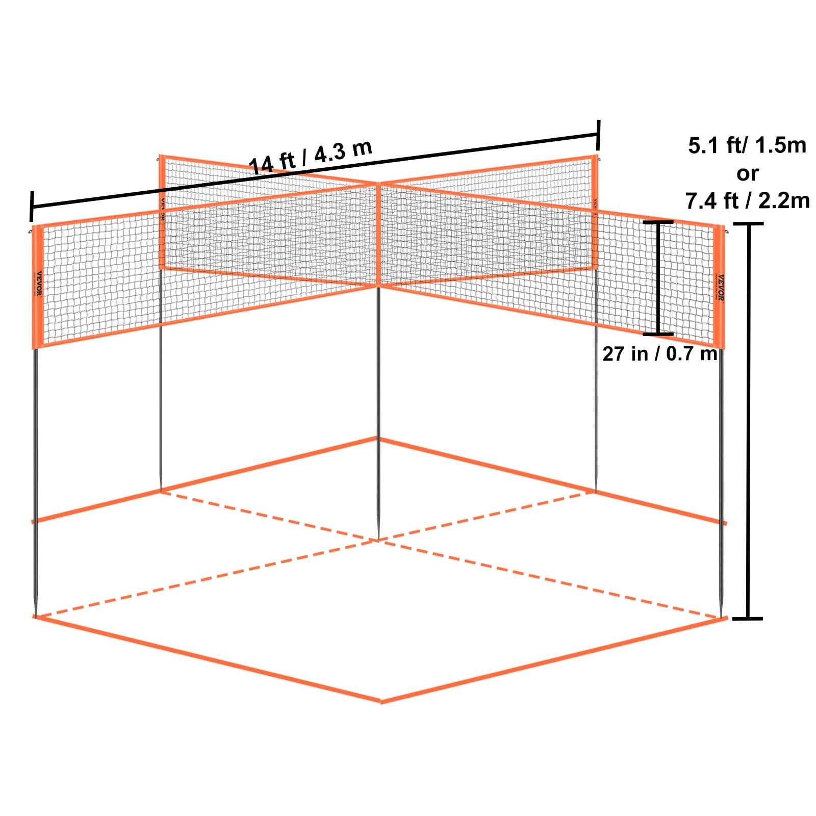 Adjustable Heights: This outdoor volleyball net offers the flexibility of two height settings, making it suitable for a wide range of players. With a lower height of 5.1 ft, it’s perfect for youths, while the taller 7.4-foot setting caters to adults, ensuring players of all ages can enjoy the game at their preferred net height. Versatile Player Combinations: Whether you have a full team of four players, a smaller group of three, or just a duo, this volleyball net accommodates various combinations effortlessly. It adapts to your player count, allowing you to enjoy the game with flexibility and convenience. Weather-Resistant & Durable: Featuring a high-strength PE net and robust 420D oxford cloth, this professional volleyball set can endure the impact of powerful hits while remaining resilient in various weather conditions. Its durability ensures long-lasting play. Reinforced Steel Poles for Stability: The thickened steel poles, with a sturdy 0.9-inch diameter, provide the necessary support. Additionally, 0.1-inch guy lines and 6-inch long stakes keep the net securely anchored, even during intense gameplay. Quick & Effortless Assembly: Enjoy games in minutes with the easy-to-use interlocking design. No tools are required for setup, making assembly a breeze. Plus, the included portable carrying bag makes it convenient to take the volleyball net with you wherever you want to play.