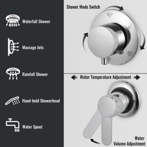 – Two Adjustable Knobs: The upper knob is designed to switch five showering modes and texture on the surface for the guide. Rotate the lower knob to adjust the water temperature(clockwise: cold water) and pull/push it to change the water outlet.