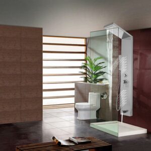 – Cool Shower Experience: There are two shower heads at the top for choice of rainfall or waterfall shower modes. Two massage jets with tiny rubber holes are set in the middle of the panel, while the water spout offers more convenience for washing.