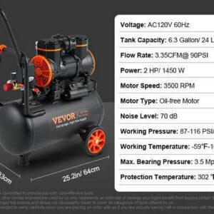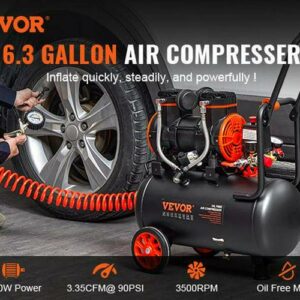 – 6.3 Gallon Air Compressor: Our 1450W oil-free motor drives the compressor up to a speed of 3500 r/min and 3.35 CFM@ 90PSI air delivery. It is ideal for supporting a variety of pneumatic and air tools, such as nail gun, impact wrench, spray gun, pneumatic screwdriver, best for tire inflation, auto repair, spray painting, woodwork nailing, etc.