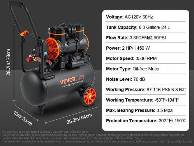 Get ready to be prepared for any challenge! Our oil-free air compressor can match different pneumatic tools to achieve multiple scenarios, such as tire inflation, auto repair, spray painting, woodwork nailing, etc. The 1450W strong motor with a 3500r/min speed and 3.35 CFM@ 90PSI air delivery can fill up the tank quickly and provide a high-flow supply. Choose VEVOR s air compressor to carry out more expansion work, taking your DIY work to the next level.