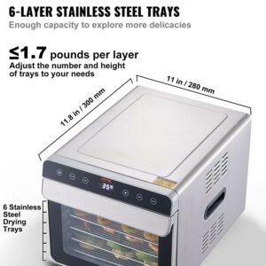 – 6-Layer Stainless Steel Trays: This food dehydrator has six stainless steel trays that are food-grade 304 and measure 11.8 x 11 inches / 300 x 280 mm each. Each layer can hold up to 1.7 pounds of food, so you can dry different types of fruits and vegetables all at once.
