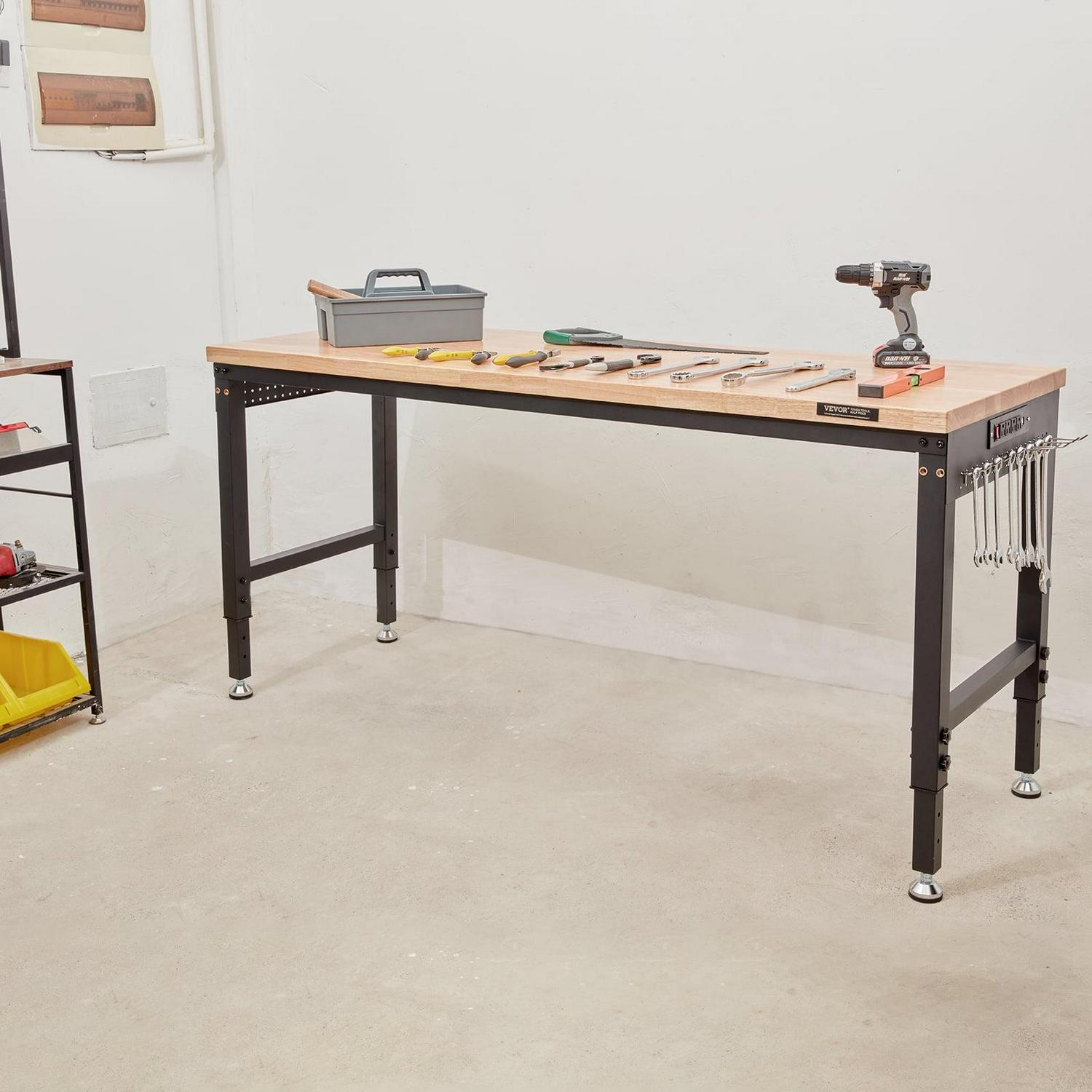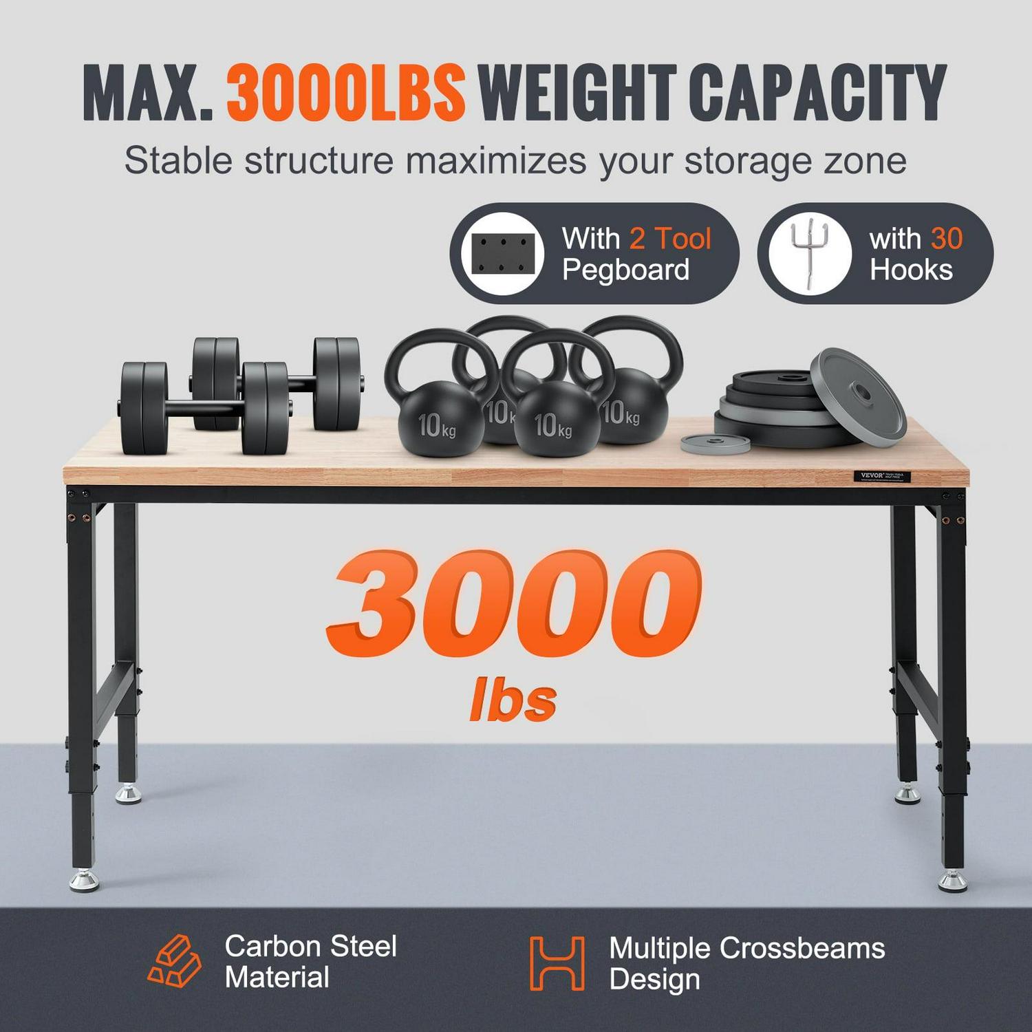 – Stable Structure: Workbench for Garage is made of heavy-duty carbon steel, with multiple crossbars designed. The workbench is made of 1.2 inch (ca. 3 cm) thick rubber wood, which is strong and hard to wear. We use the transparent coating for environmental protection. Effectively prevents the table from moldy. Maximum load bearing is up to 3000 lbs.