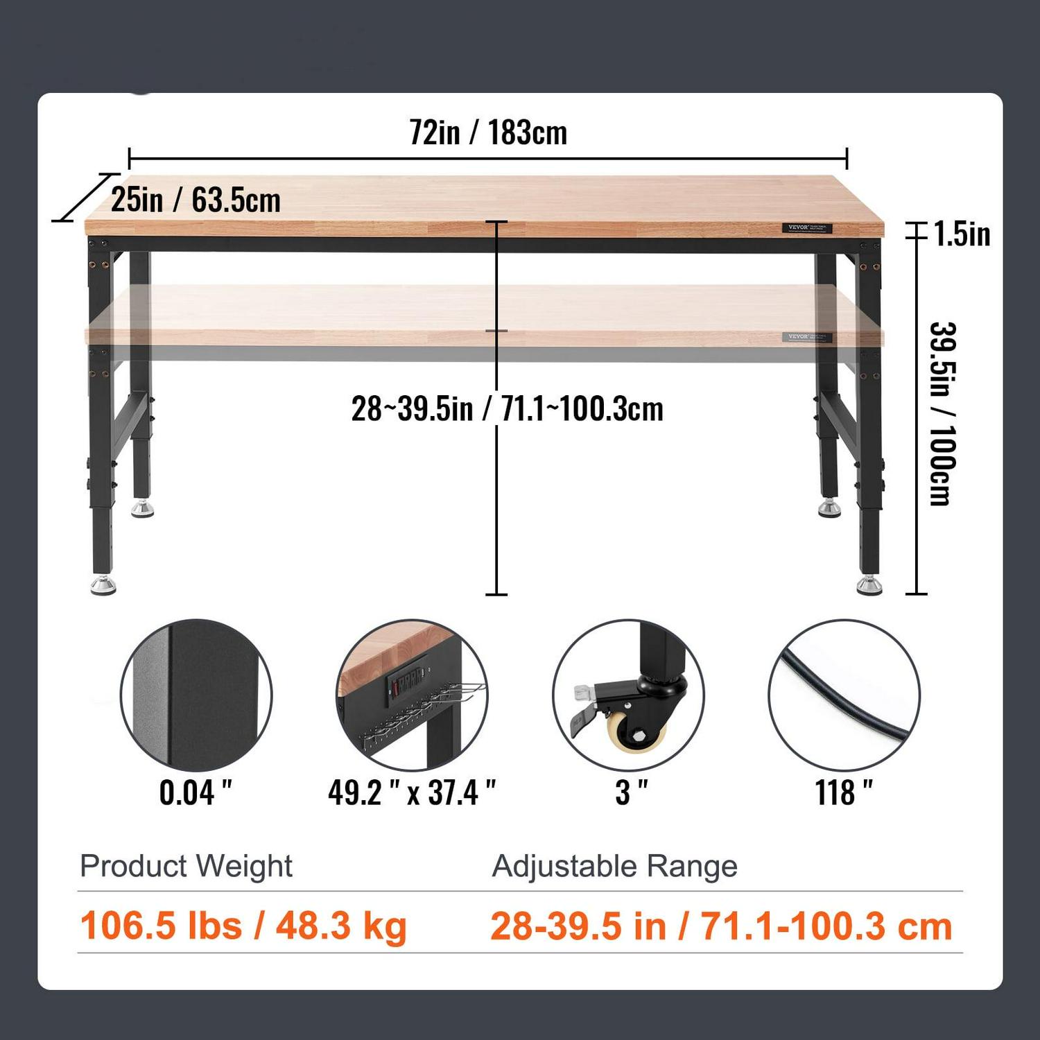 – Adjustable Height Workbench: Work Table size is 72 x 25 x 39.5 inch (1829 x 635 x 1003 mm ± 3 mm). The height adjustment range is 28 ~ 39.5 inch (711-1003 mm ± 3 mm). There are 10 height adjustment holes, allowing you to adjust the table to the suitable height manually effortlessly without tools.