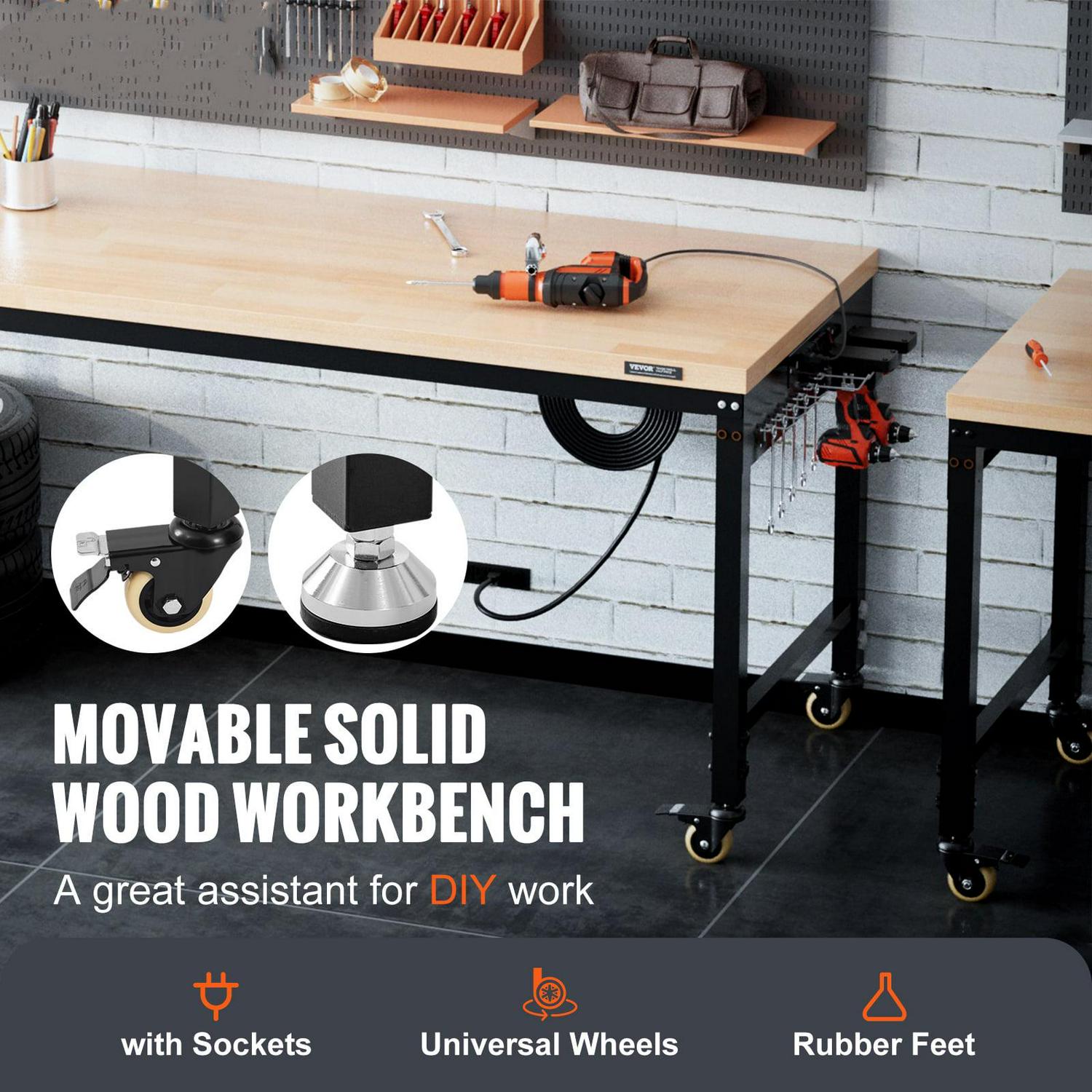 The height of the solid wood work bench is adjustable, and the stable structure can withstand a weight of up to 2000lbs. It is equipped with a built-in power board and a movable universal wheel that can follow you to any work place, making it more convenient and faster for you to complete your work.