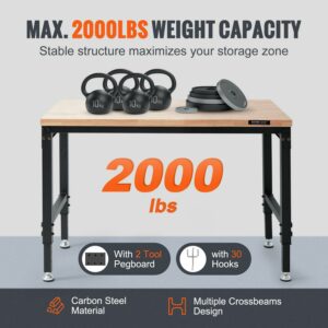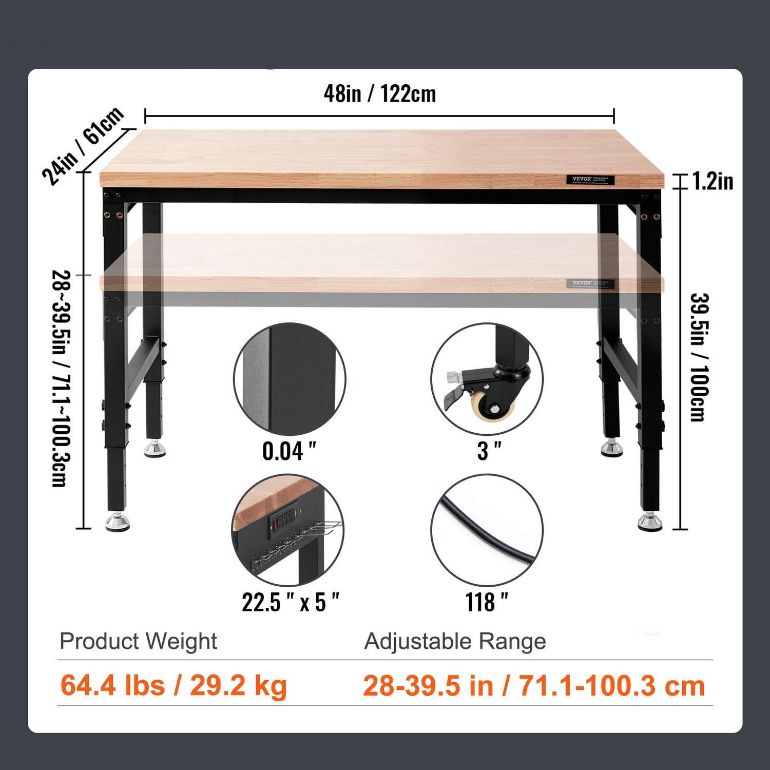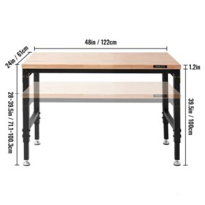 BENTISM Adjustable Workbench, 48 L X 24 W Multi-Purpose Work Bench with 28-39.5 Height Range and 2000 lbs Capacity, Power Outlets and Hardwood Top and Metal Frame and Foot Pads, Workshop Garage Table
