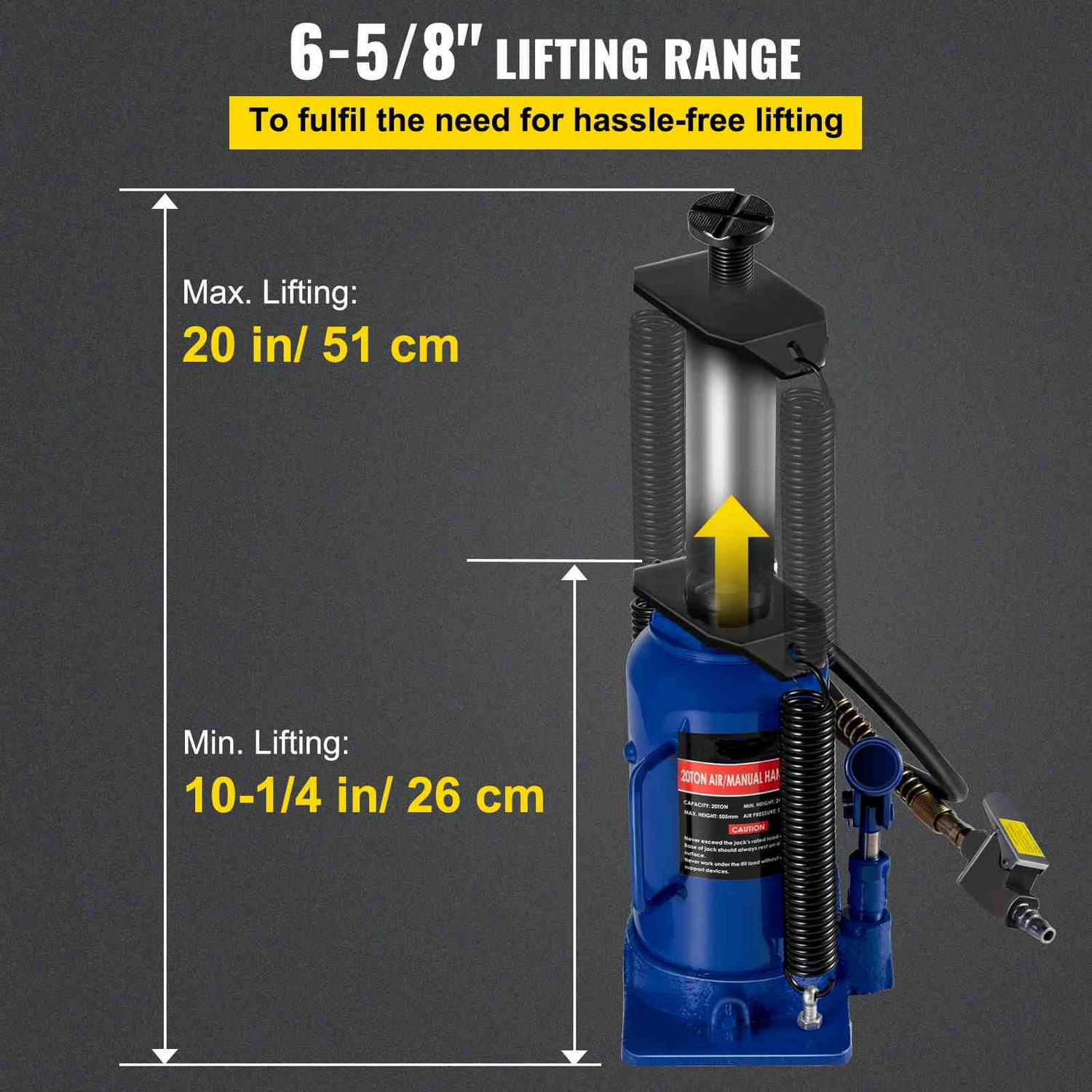 – High Capacity – The load capacity can reach up to 20 Ton (44092 lbs), Max Pressure: 200PSI. It is powerful to be a jack tool for automotive repair and emergency.