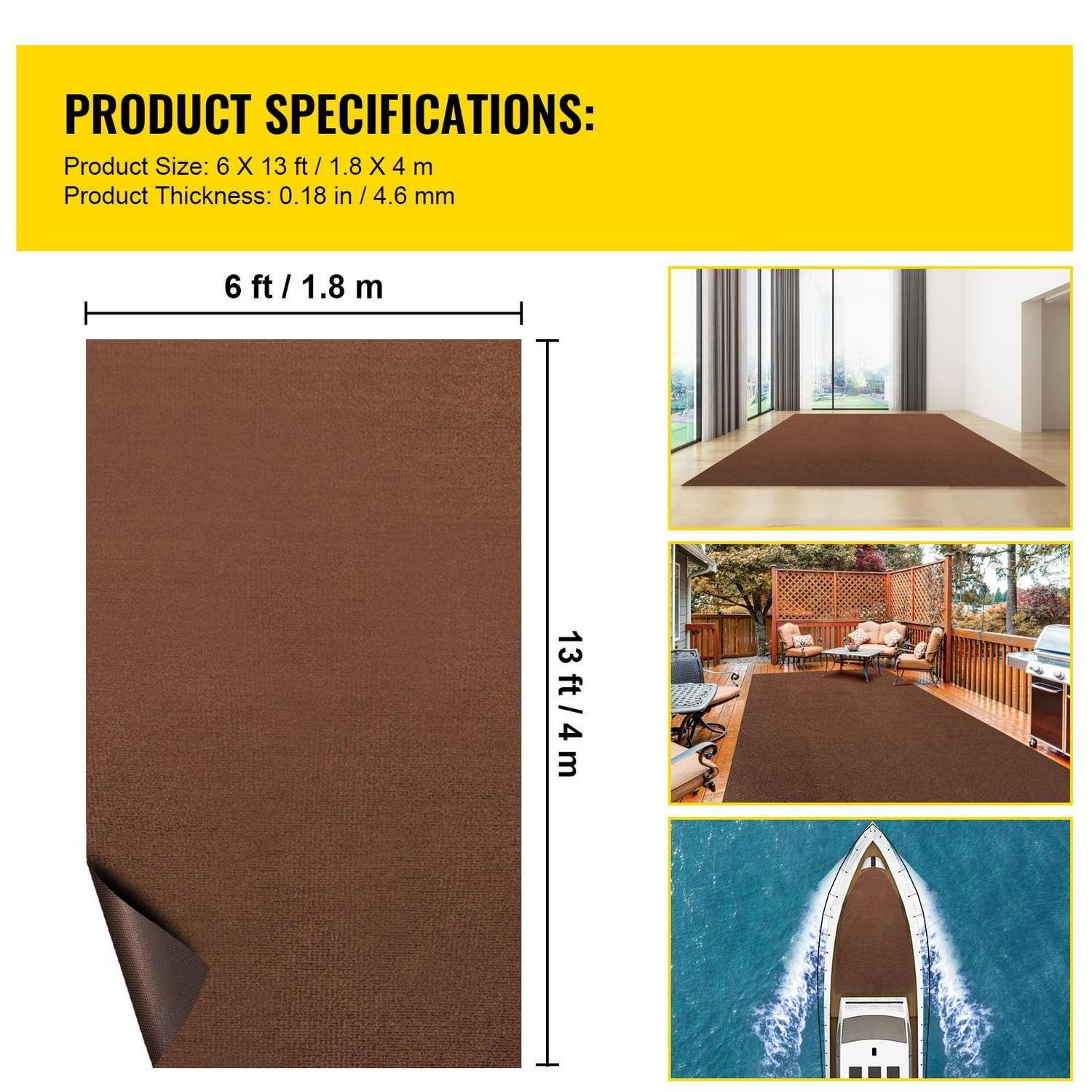 – Premium Marine Carpet: Color: Deep Brown; Size: 6 x 13 ft(1.8 x 4 m); Carpet Thickness: 0.18 in(4.6 mm). Our high-quality marine carpet is made of polyester fiber, featuring a vapor-proof and non-deformed performance. Long-time use can save your costs. Besides, the deep brown color makes it quite modern.