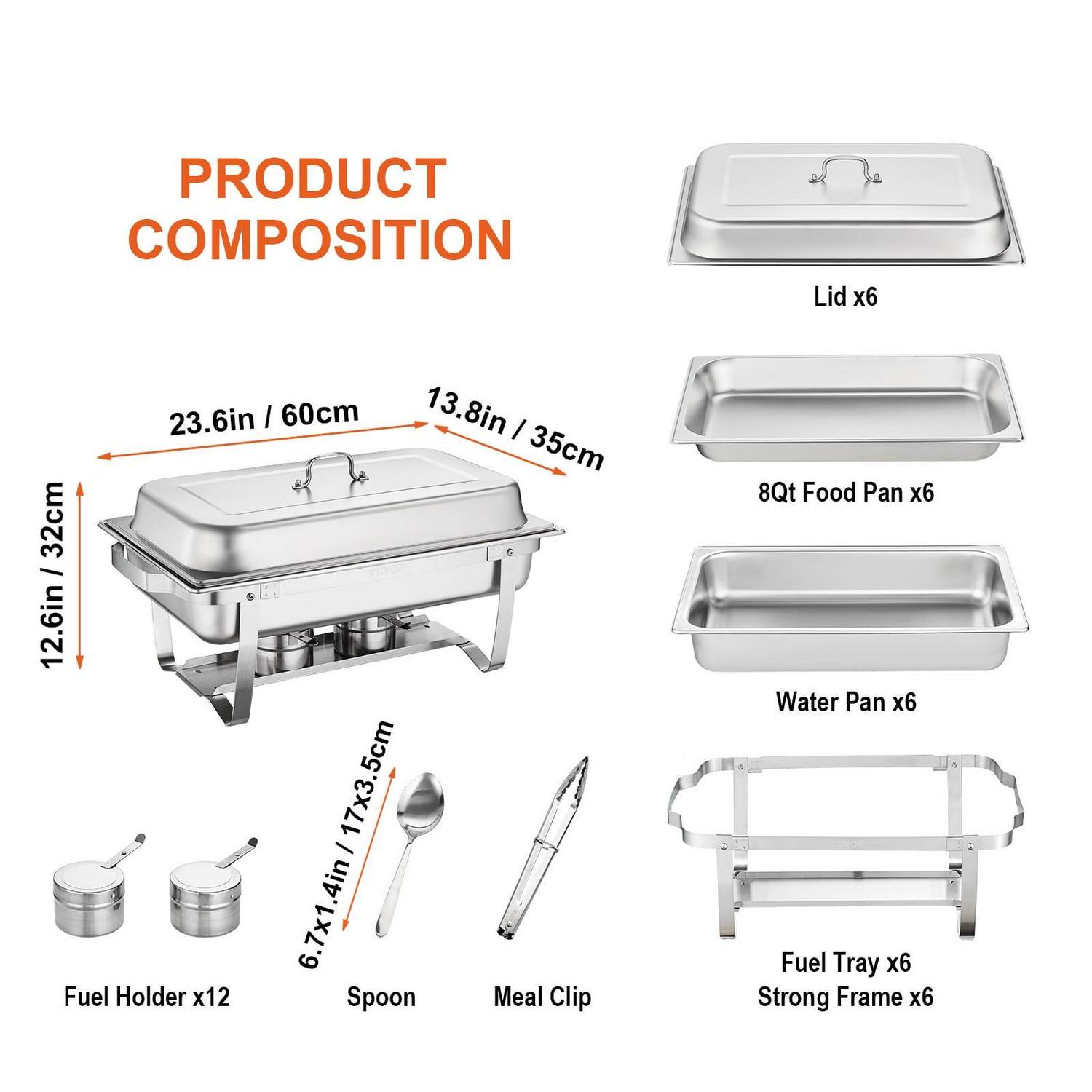 – Complete Accessories Set: This chafing dish buffet set contains 12 fuel holders (fuel is not included), 6 foldable frames, 6 fuel trays, 6 water trays, 6 x 8 Qt full-size food pans, 6 lids with handle, 1 clip, and 1 ladle as a gift. Convenient to prepare, display and enhance your next catered event elegantly.