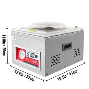– Premium Sealing Effect: Motor Power: 180W. Max. Sealing Size:260mm x 8mm. Vacuum Pump Rate:6.5cbm/h. Chamber Size: 13 x 10.6 x 2 in. Thanks to the high-performance pump and large sealing size, our chamber vacuum sealer effectively extends a product’s storage period and ensures that foods still keep their original taste.