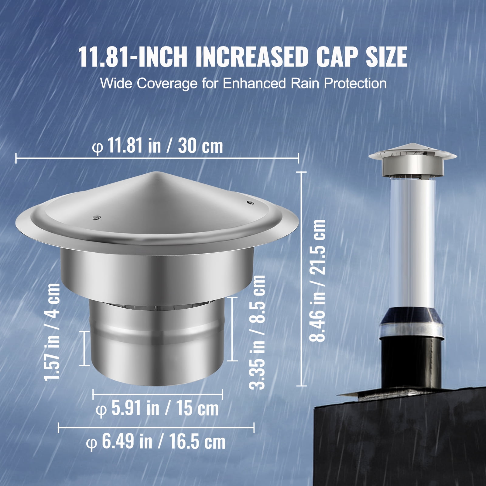 Product Description Round Base Cone-shaped Rain Chimney Cap-Make Your Life More Convenient! No more worries about blockages caused by rainwater or debris entering the flue. The 11.81-inch oversized cap provides extensive rain protection, ensuring your chimney stays perfectly shielded during rainy or stormy weather throughout the year. Upgraded Material Carefully selected durable 304 stainless steel plate, providing rust resistance, wear resistance, and erosion resistance. You no longer need to worry about adverse weather damaging your chimney throughout the year, enjoy the long service life. Removable Top Cover The top cover is equipped with screws, making it easy to dismantle for routine chimney cleaning. With slanted side panels, it effectively prevents debris, rain, and snow accumulation, making it more convenient and straightforward. Suitable for Multiple Chimneys Our chimney flue cap is compatible with various chimney types, providing flexible protection to keep flames burning and firewood dry. It effectively prevents hazards caused by strong winds and downdrafts, ensuring safety for different chimney setups. Professional Accessories We offer a complete set of accessories suitable for different installation methods, along with thoughtful instructions and pre-drilled holes to facilitate quick and easy installation. Specifications Item Model Number: SRC-6-C Material: 304 Stainless Steel Net Weight (including all accessories): 1.54 lb / 0.7 kg Gross Weight (including all accessories and packaging): 2.65 lb / 1.2 kg Item Dimensions (L x W x H): 11.81″ x 11.81″ x 8.66″ / 300 x 300 x 220 mm Panel Diameter: Φ5.91″ / Φ150 mm Panel Thickness: 0.02″ / 0.6 mm Top Plate Diameter: Φ11.81″ / Φ300 mm Top Plate Thickness: 0.02″ / 0.6 mm Package Content Side Panel x 1 Top Plate x 1 User Manual x 1