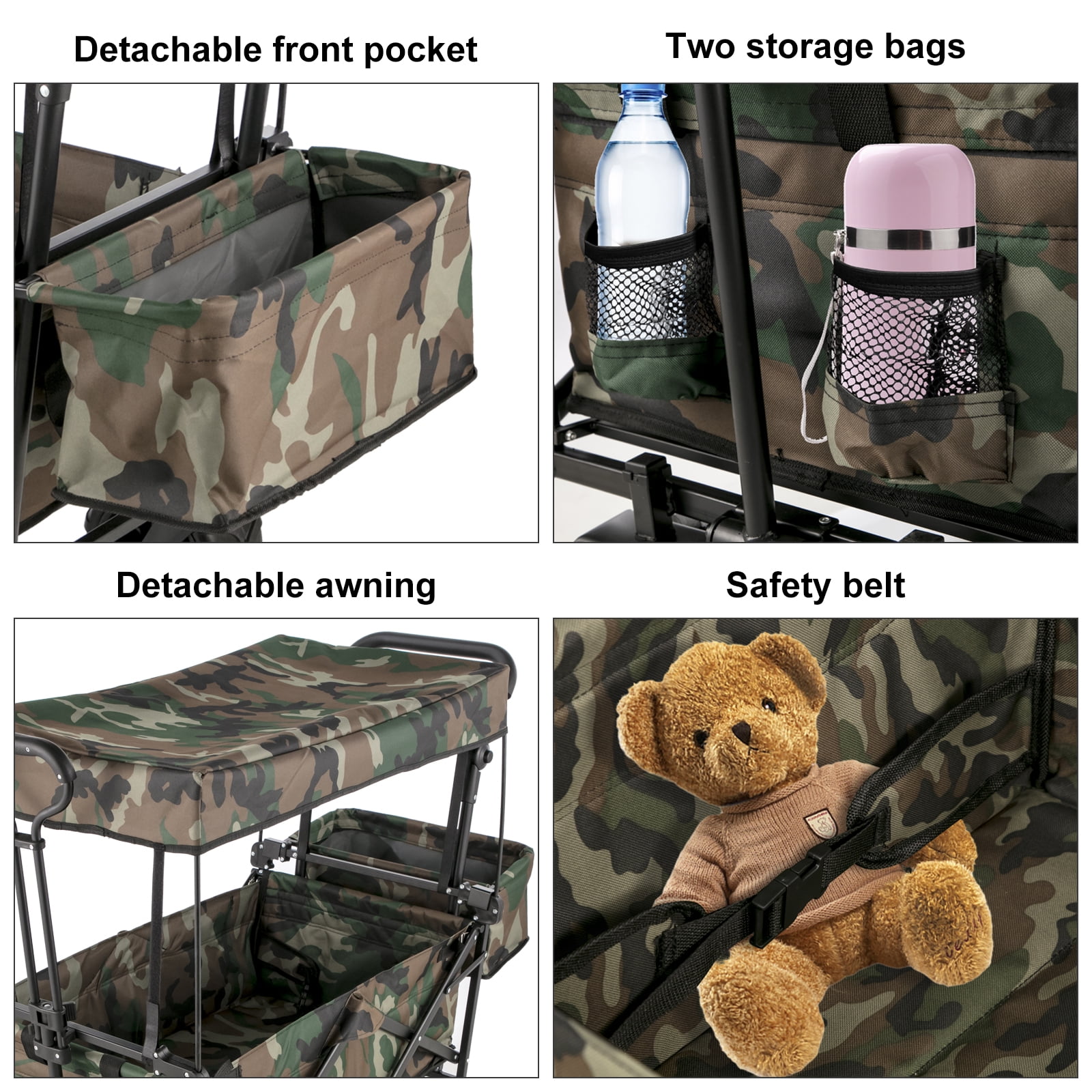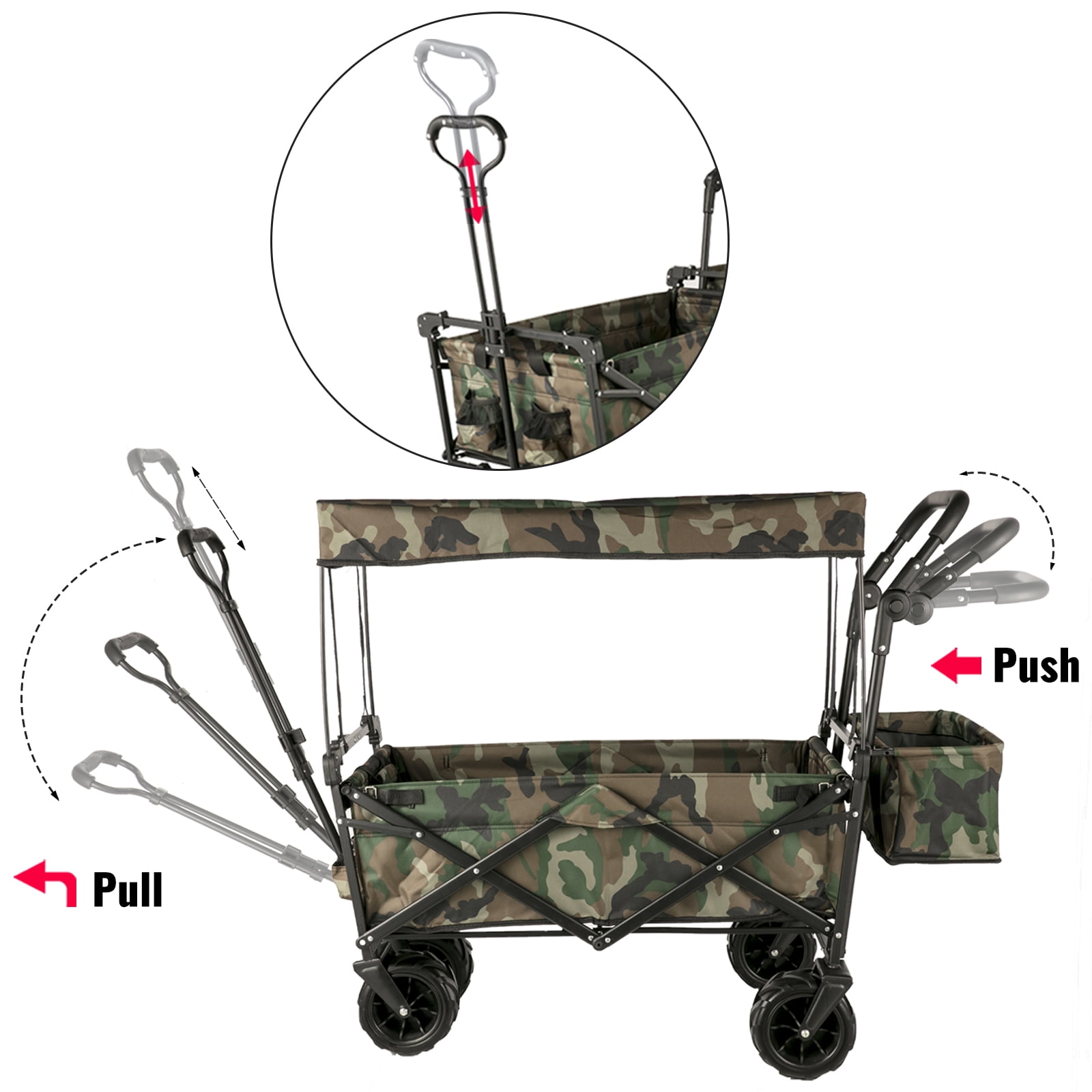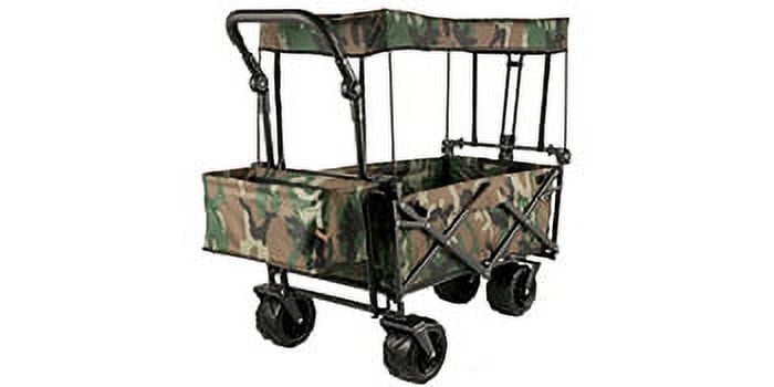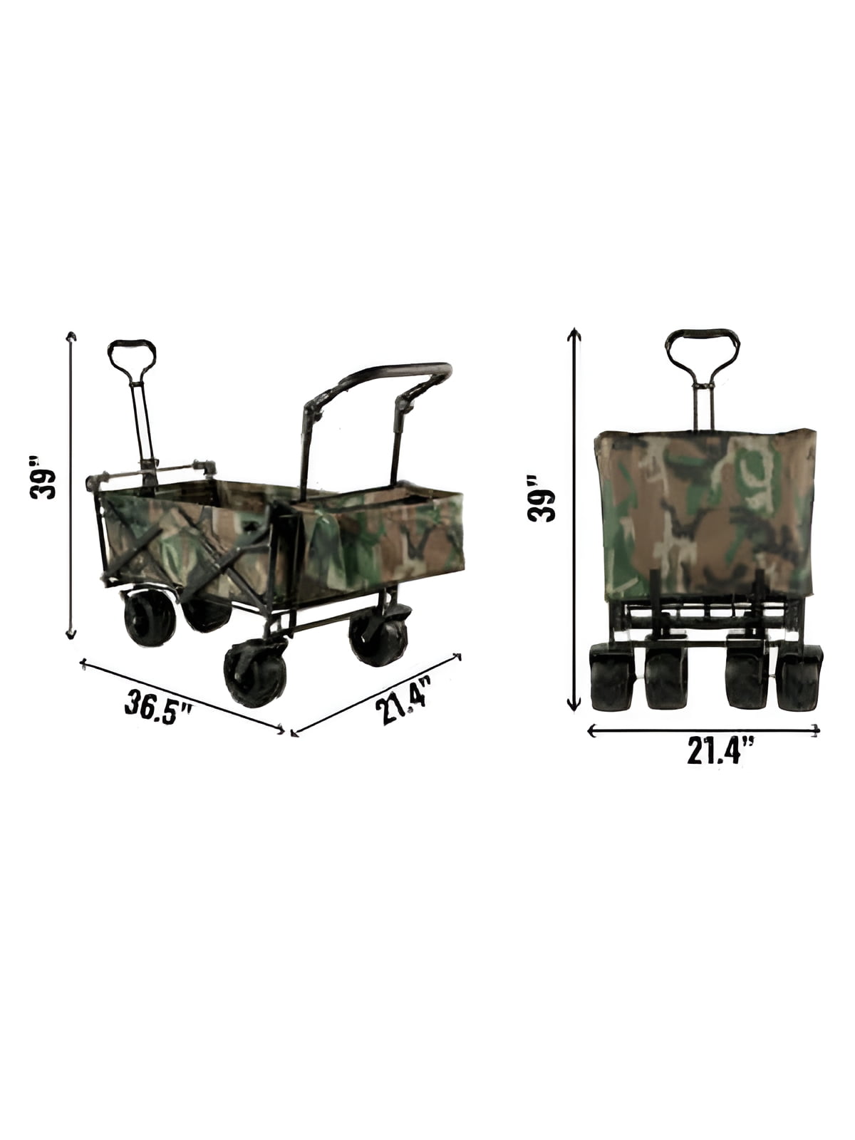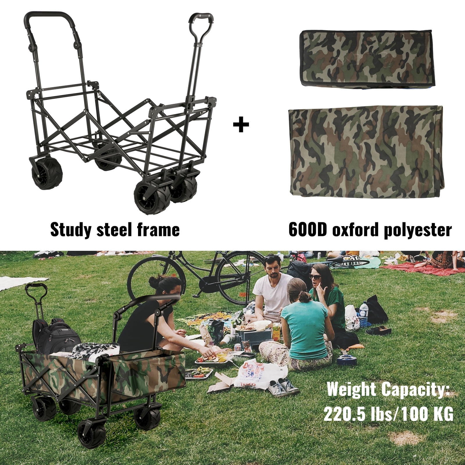 Product Description Camping Folding Wagon Cart The camouflage utility folding wagon cart with detachable canopy and all-terrain wheels is made of waterproof 600D oxford cloth and a sturdy steel frame. The 360-degree rotating off-road wheel is adopted to complete your parking, pushing, and pulling more smoothly. Larger storage space, an extra storage basket, and two mesh bags provide additional storage space. It can be opened and folded up easily in seconds. This wagon cart is a practical and convenient tool for packing and moving things in outdoor activities. High-Quality Materials The collapsible wagon is constructed of a strong steel frame and 600D oxford polyester material to strengthen the solidity and durability. The folding wagon is detached for easy cleaning. Superior Details The foldable wagon cart includes an oxford-cloth canopy, which is quite easy to assemble and detach. The grocery cart provides an extra storage basket, two mesh bags, and a safety belt for your convenience. Push & Pull Handle The wagon cart includes two adjustable and telescoping handles for effortless transport, which allows you to pull or push the wagon at ease. The handle behind also can be adjusted height. Foldable Wagon Cart The foldable wagon is folded into a portable size of 39″x20.4″x7″. Sets in seconds, no assembly required. It can be folded into a small size carry bag for convenient storage. Large Beach Wheels The wheel of the beach wagon cart is 4″ wide and 7″ in diameter, which can rotate at 360°, and it can move smoothly and go anywhere. Wide Application The wagon collapsible is designed to pack and move objects in outdoor activities, such as big shopping days, camping, fishing, parks, barbecues, sports, picnic, beach, garden, etc. Specifications Frame: Powder-coated folding steel Fabric: 600D oxford polyester Color: Camouflage Product Dimensions: 39″x21.4″x39″/98.5×54.3×98.5 cm Folded Size: 39″x20.4″x7″/98.5x52x17.8 cm Max Pulling Handle Size: 39″/98.5 cm Max Weight Capacity: 220.5 lbs/100 kg Package Content 1 x Folding Wagon Cart 2 x Nylon Tie Ropes 1 x Installation Tools