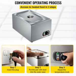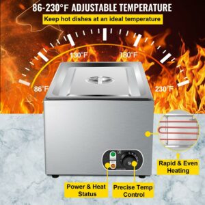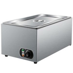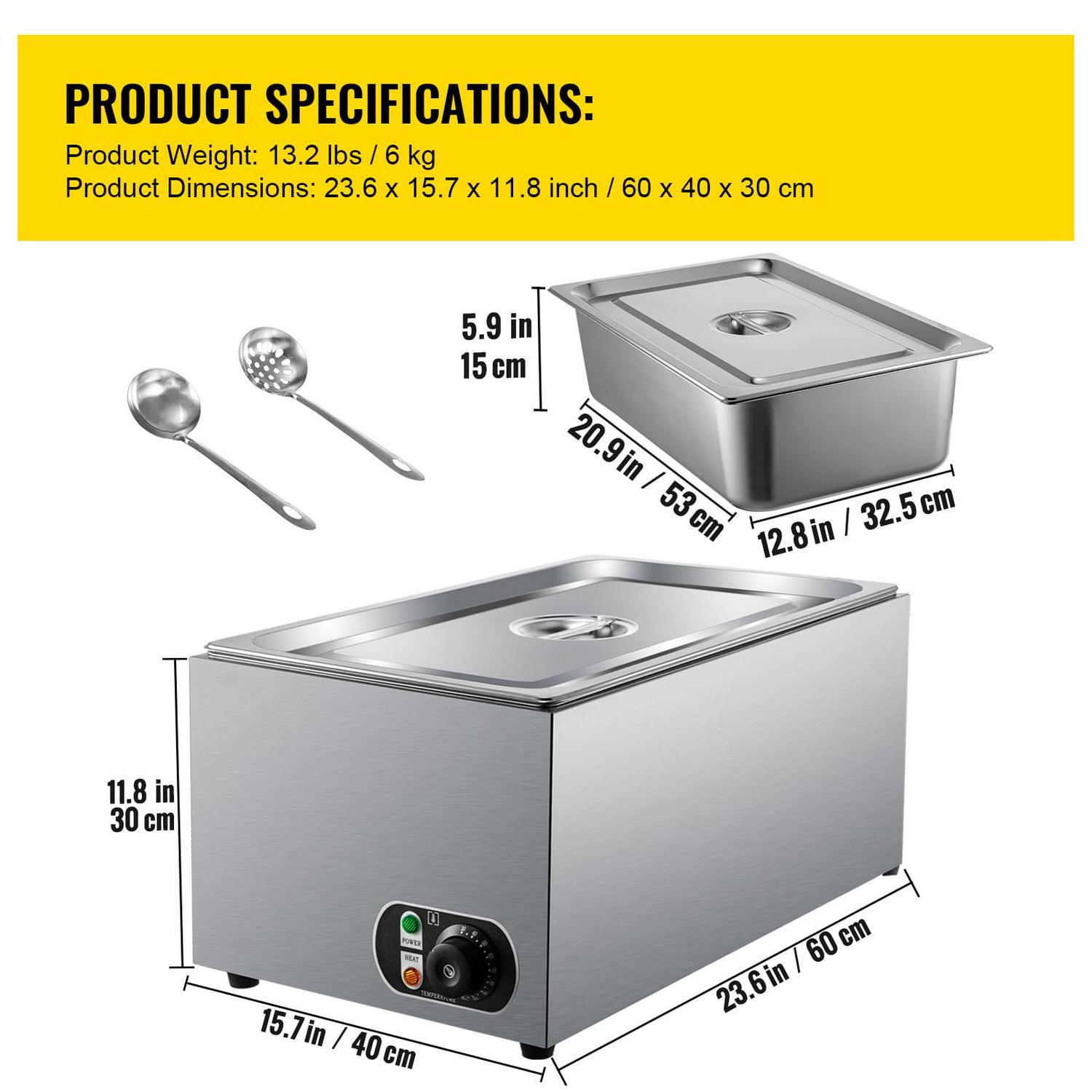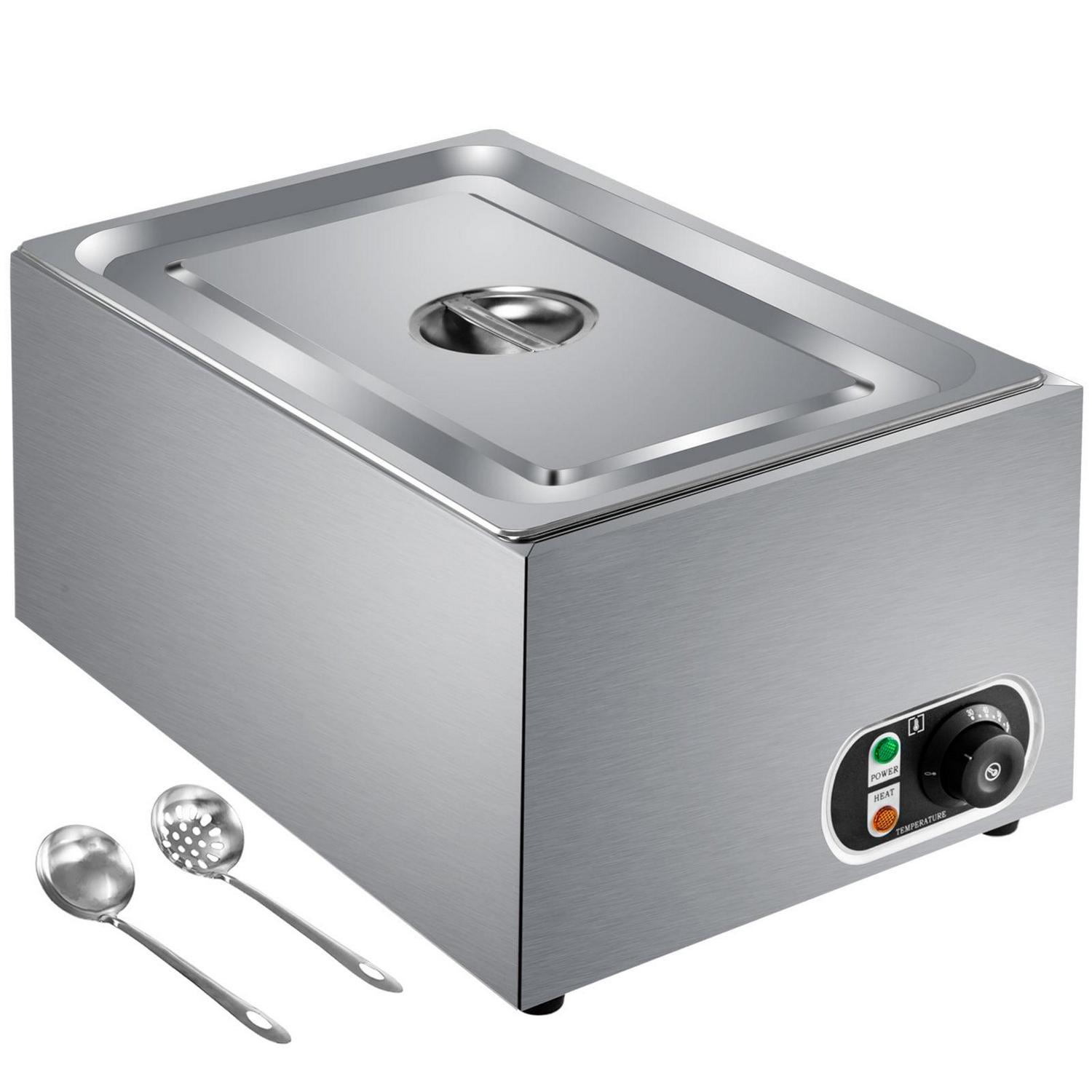 This commercial food warmer has a 27 qt capacity pan and can contain a more considerable amount of food at one time. It possesses a thermostatic knob in the range of 86 to 230 (30 to 110 ), ensuring the food taste. It is equipped with an efficient heating tube for rapid and even heating. It is a sturdy and durable food warmer featuring nonslip feet, a practical lid, and two extra-offering ladles. This steam table warmer is the best choice for various home and commercial use.