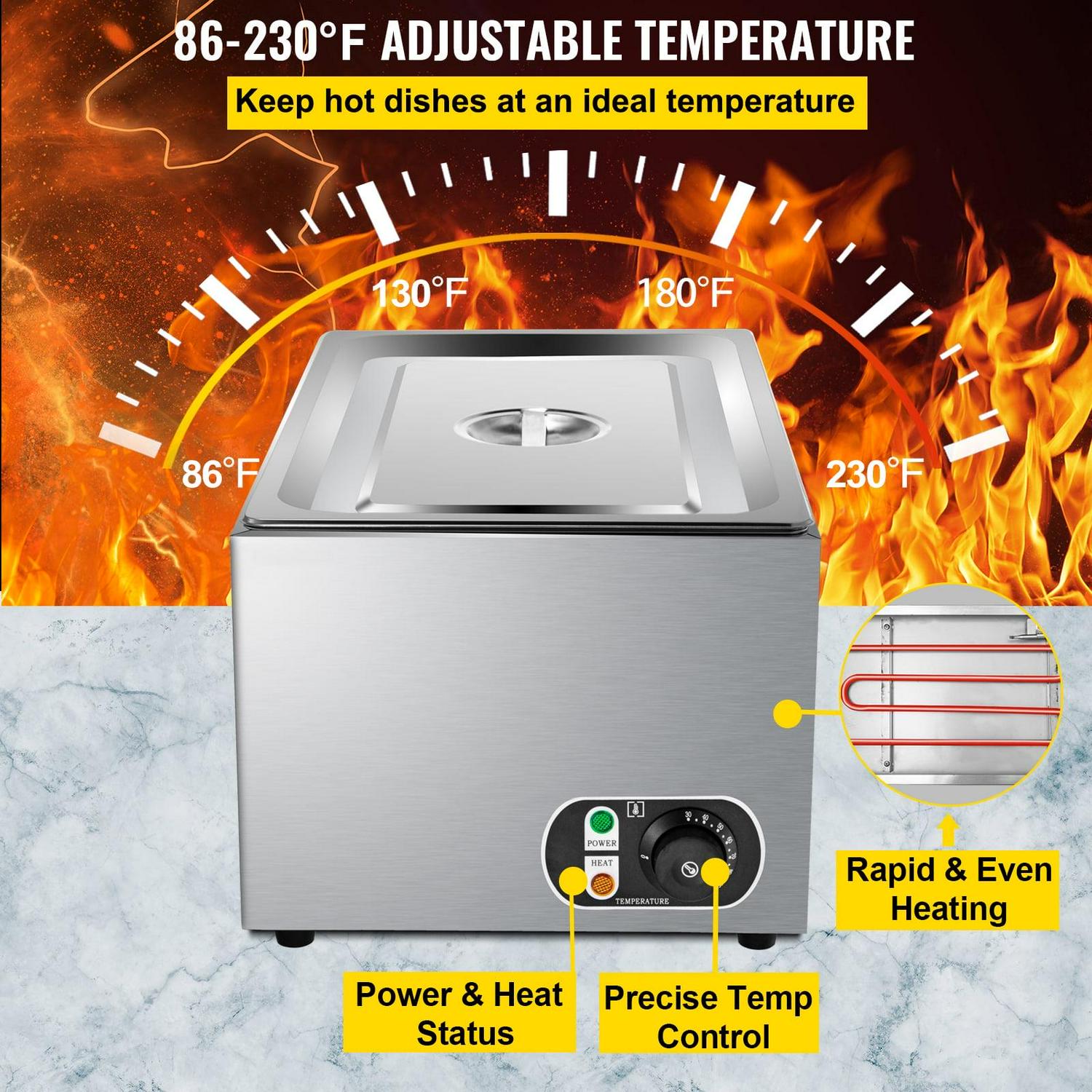 – Precise Temp Control: Our steam table warmer possesses an adjustable temperature knob in the temperature range of 86-230 (30-110 ), ensuring the food taste. This 1200W commercial food warmer is equipped with a heating tube. This heating element adopts three-dimensional heating with high-temperature circulation and a larger heating area to achieve efficient heat transfer, significantly reducing your waiting time.