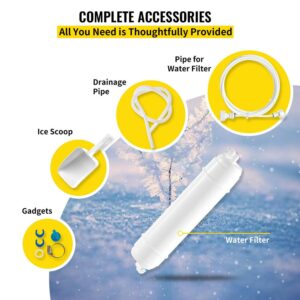 – Easy to Connect & Use: Our commercial ice cube maker comes with a water filter, turning the tap water into drinkable pure water. It is reliable to filter the impurities and easy to connect with the tools included. This ice machine would work properly in different places wherever the water and power supply are ready. Plus, a drainage pipe and ice scoop are also provided. The former is for discharging the melted ice in time, and the latter is convenient and hygienic for fetching the ice cubes out.