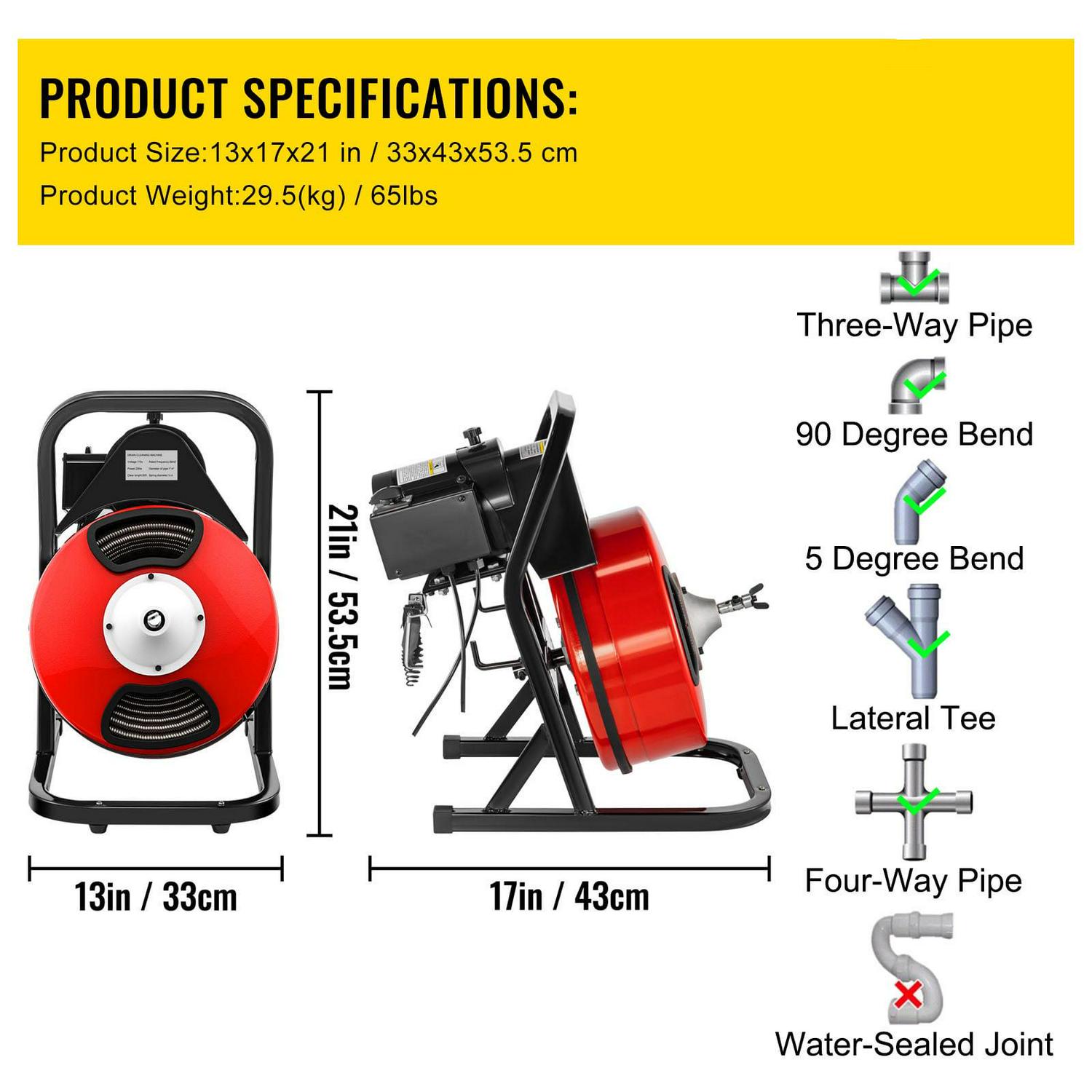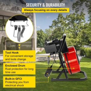 – Security and Durability: Built-in GFCI (ground fault circuit interrupter) attached to this electric drain snake avoids electrical shock, ensuring your security. Fully-enclosed cable drum keeps the machine clean during prolonged use. A portable handle is beneficial to easy transport. A small tool tray/hook designed on the frame plays a unique role in convenient storage and tool change.