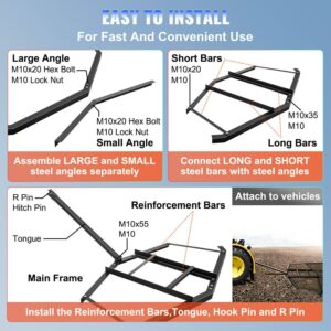 – EASY ASSEMBLY – This tractor rake is all black. We provide a complete set of mounting fittings. Length: 70”. Width: 66”. Height: 4”. It is wide enough to cover large swaths of land, so you can get the job done quicker.