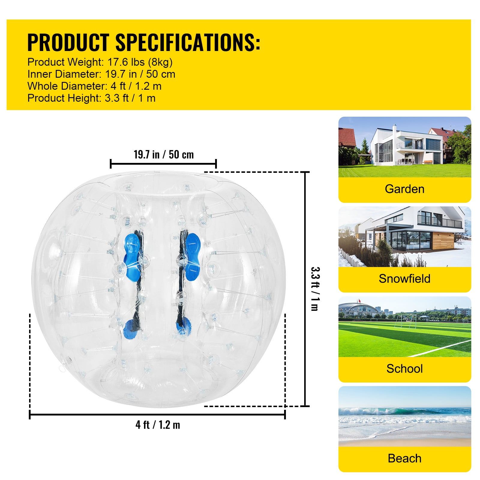 【PREMIUM MATERIAL】- 2 Pack 1.2M Bumper balls made of eco-friendly 0.8mm PVC, durable, odorless, waterproof, anti-static, not easy to deformation, have good seaming, designed for long-term use. 【ERGONOMIC DESIGN】- Ball zorb has 2 handles and 2 adjustable shoulder straps, tightly keep users inside. If you lose hold of the handles, the shoulder straps will guarantee your safety. 【EASY TO INFLATE】- Inflatable bubble bumper balls, can be easily inflated by electric pump or air pump in minutes.(Pump is not included). Ready to enjoy the fun the day you receive our ball. 【EASY TO CARRY】- Only takes few minutes to be deflated, then you can roll it into a small piece for simple move and storage. Be sure to keep it from sharp objects. 【WIDE USE】- Widely used in backyard, park, beach, playing center. Playing games like Bubble Soccer, Bull rush and Last One Standing. 1.5m dia balls suit for adults above 1.6m/5.2ft, 1.2m dia balls suit for children from 1m/3.3ft to 1.5m/4.9ft.
