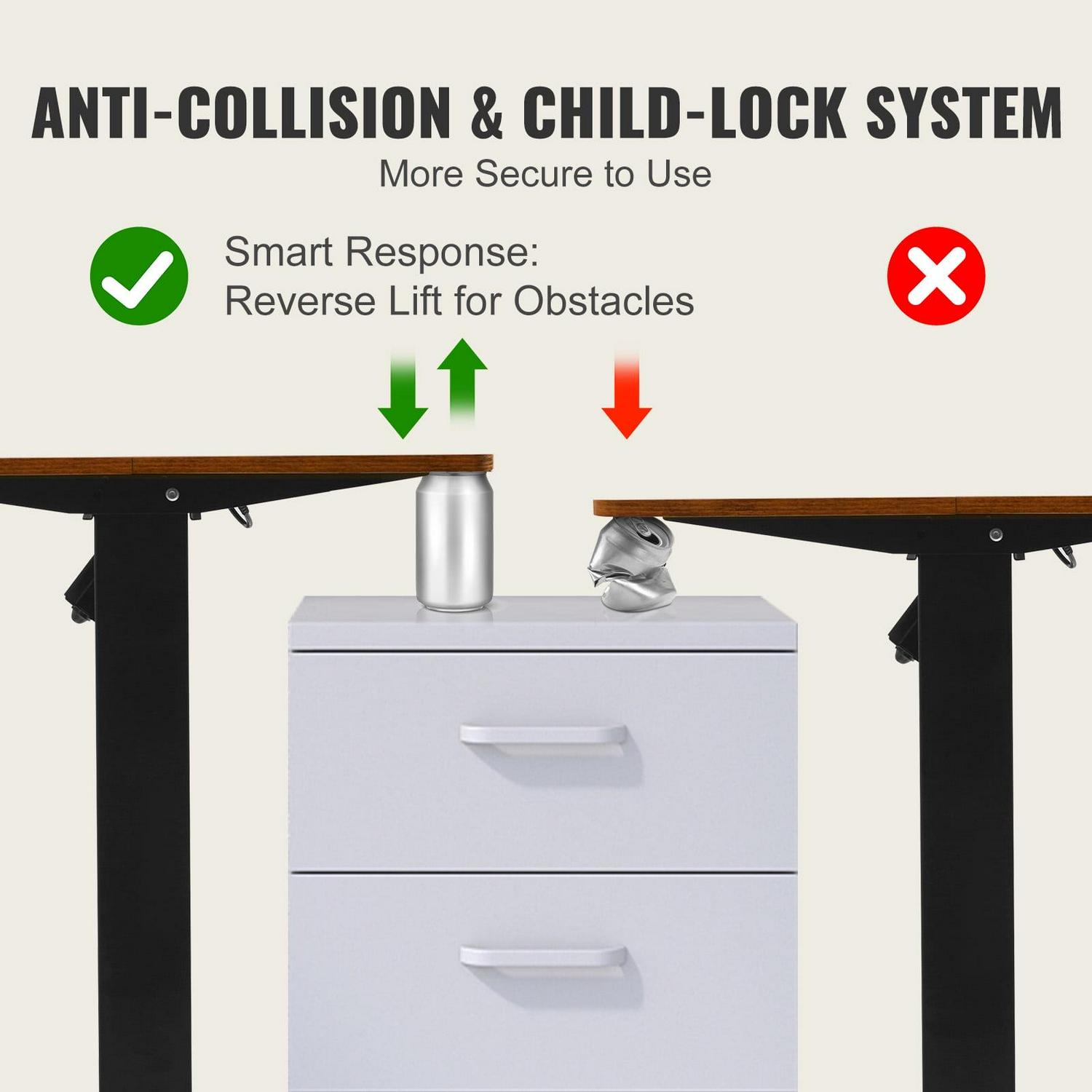 – Anti-Collision & Child Lock Protection: The collision-free technology ensures that when encountering obstacles during lifting, the desk moves in the opposite direction to stay away from collisions. Activating the child lock protection mode is as simple as a 5-second long-press of the “S” key, ensuring the safety of children and preventing accidents.