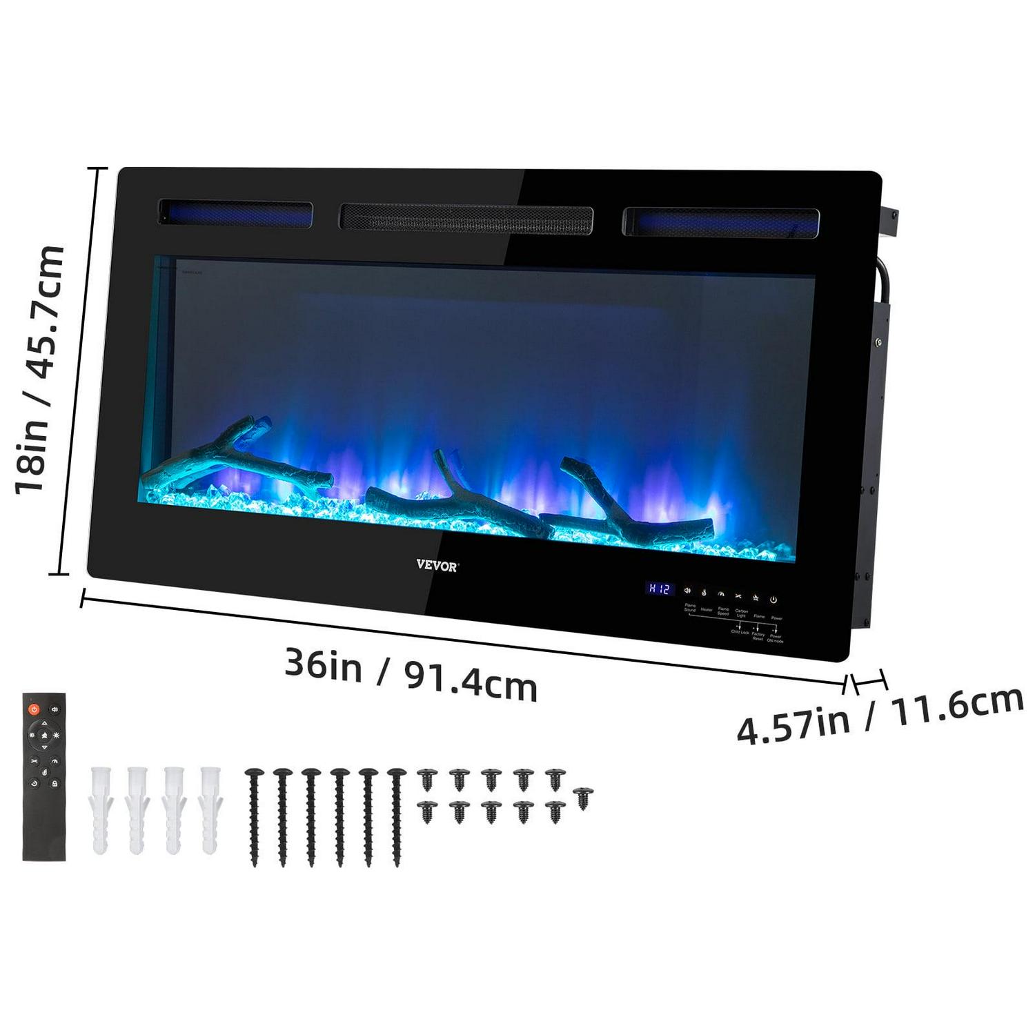 – Realistic & Attractive Flame: Product Size: 36 x 4.57 x 18 in (91.4 x 11.6 x 45.7 cm). Power: 1500 W. Thanks to its constructed glass-coated screen, the electric fireplace will bring you realistic visual of flames. Also, a large-scale screen perfectly magnifies the swinging burning flame. Multiple combinations of 12 flame colors, 5 flame speeds, and 5 brightness are provided to set the mood. It comes with crystal and artificial firewood to add a more cozy and vivid ambiance.