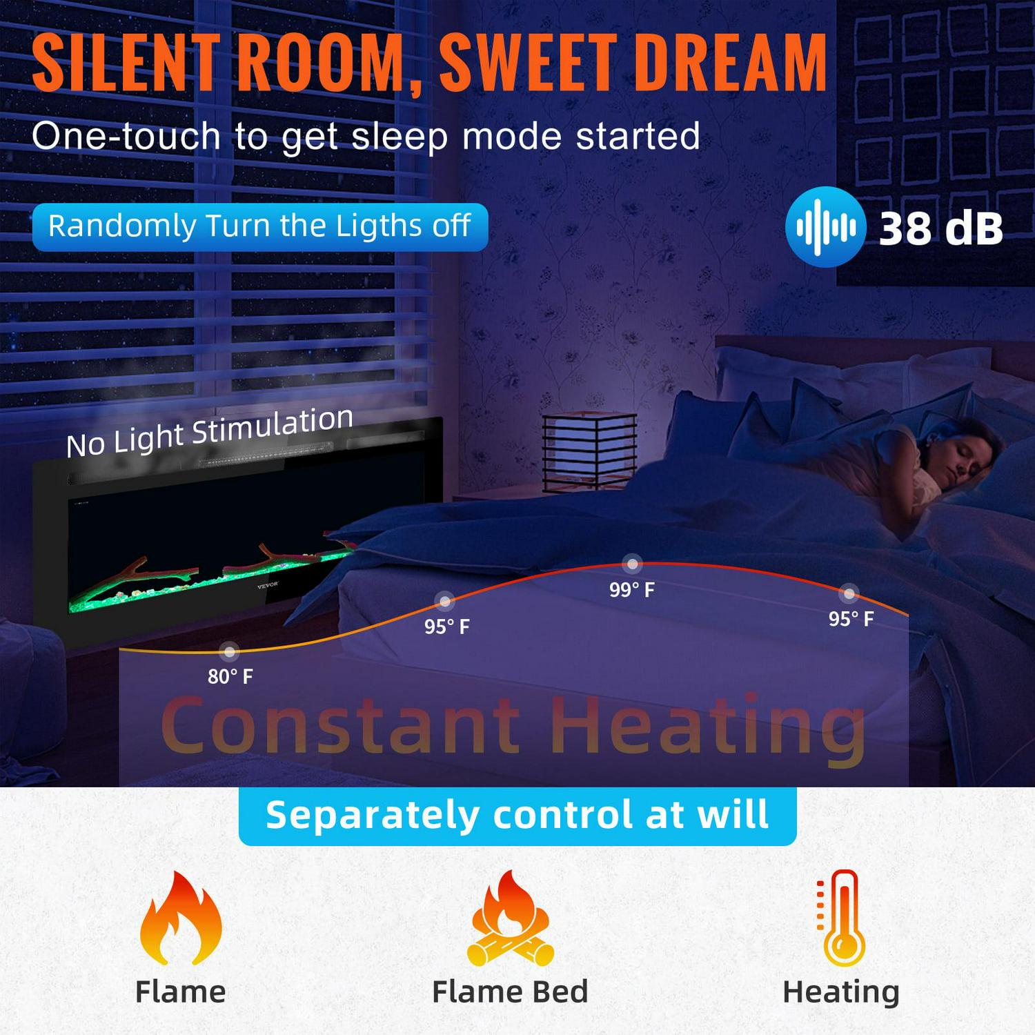 – Warm in Silent: This 36-inch fireplace is equipped with a sleep mode which maintains a constant heating temperature between 60 to 99 °F and features an adjustable timer that can be set from 0 to 12 Hours. The independent switch can adjust the heating and flame, ensuring warmth while remaining energy-saving. Features low noise at 38 dB. You can turn it all up during freezing winter nights and stay snug and warm.
