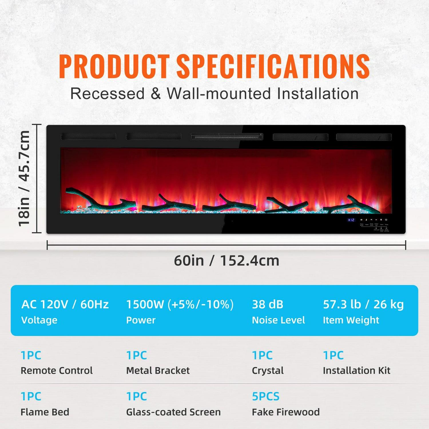 – Realistic & Attractive Flame: Product Size: 50 x 4.57 x 18 in (127 x 11.6 x 45.7 cm). Power: 1500 W. Thanks to its constructed glass-coated screen, the electric fireplace will bring you realistic visual of flames. Also, a large-scale screen perfectly magnifies the swinging burning flame. Multiple combinations of 12 flame colors, 5 flame speeds, and 5 brightness are provided to set the mood. It comes with crystal and artificial firewood to add a more cozy and vivid ambiance.