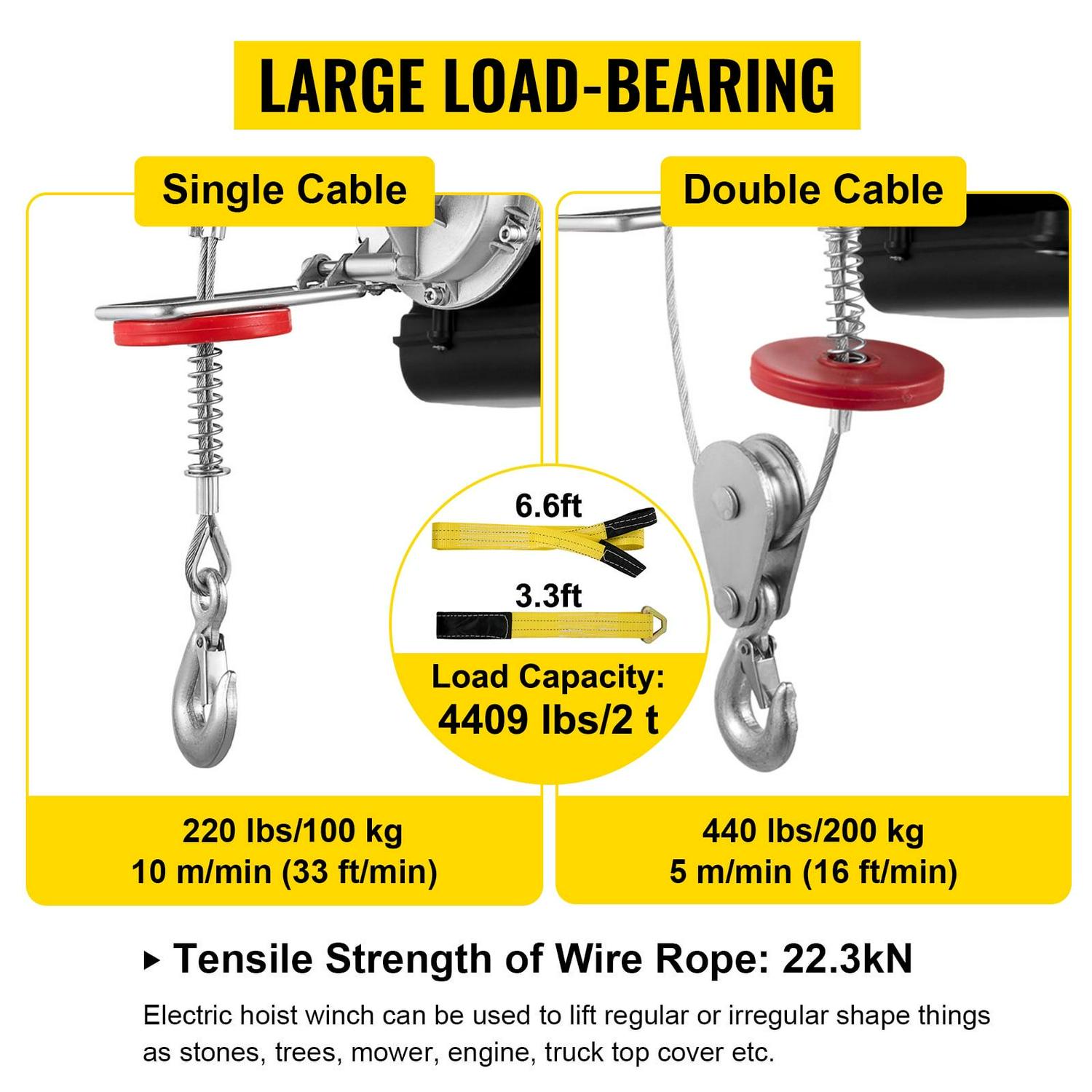– Reliably Powerful Lifting: The high-quality copper motor provides strong power that can bear large force without deformation for this electric winch. Single line capacity: 220 lbs/100 kg; double line capacity: 440 lbs/200 kg.