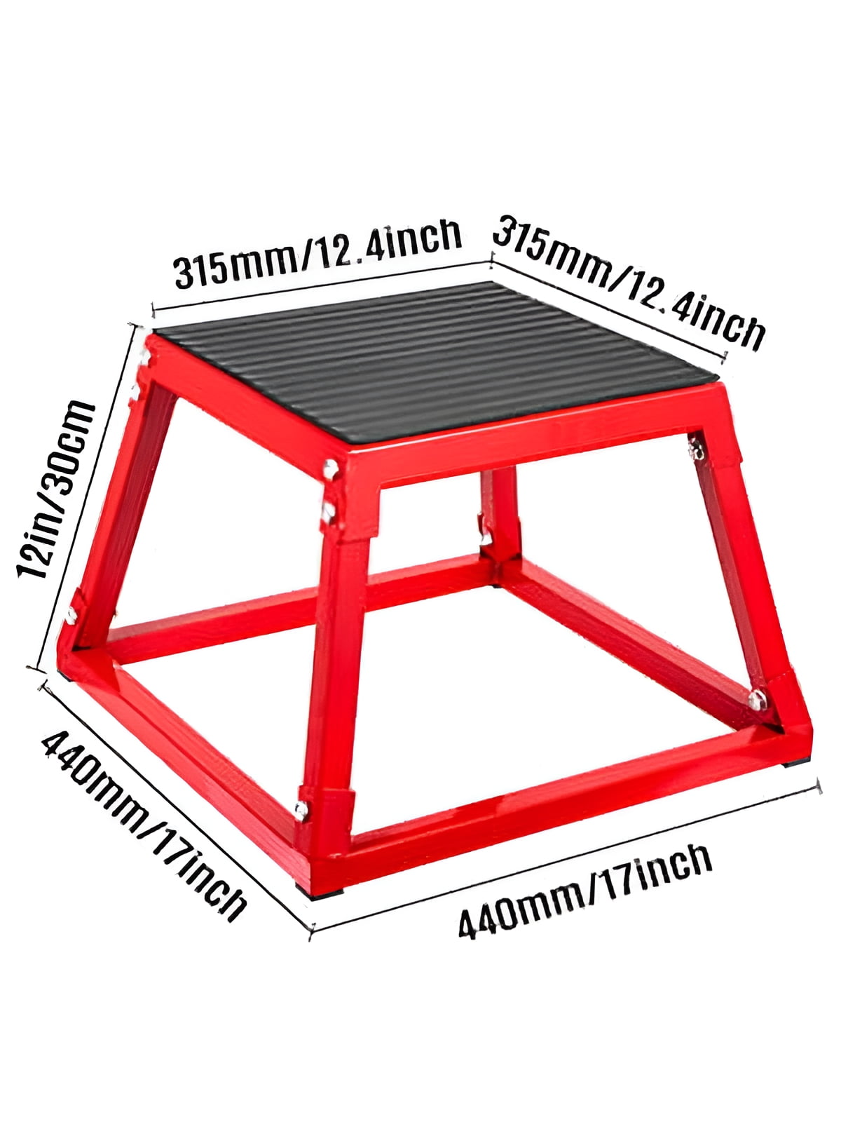 Product Description 12” Plyometric Jump Box Here we offer you this outstanding jump trainer, and it is widely used in gyms or at home for plyometric and explosive training. Our plyo boxes are the simplest and effective boxes that you deserve to have. Come and get one right now. Specifications Color: Red Material: Steel, iron Height: 30 cm/12” Size of Top: 315×315 mm/12.4”x12.4” Size of Base: 440×440 mm/17”x17” Weight: 4.3 kg/9.5 lbs Package Content 1 x Plyometric Platform Box