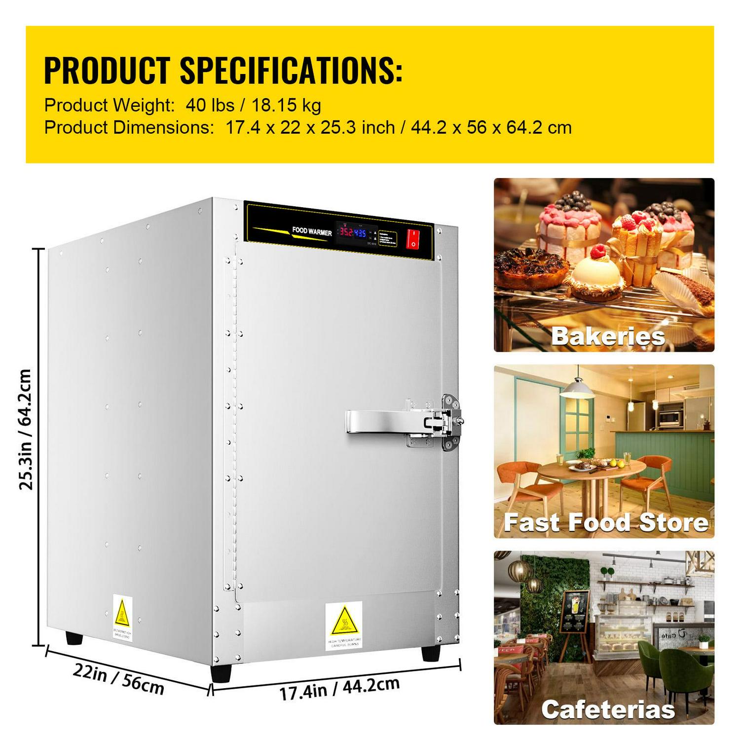 – High-quality Aluminum Construction: Constructed of non-corrosive aluminum, this food warmer can hold prepared foods at proper serving temperatures for extended periods of time. The lightweight frame on this warmer allows for easy mobility. The trays are made of stainless steel and is very easy to pull, the door hinge allows you to open the door at a maximum angle of 180°.