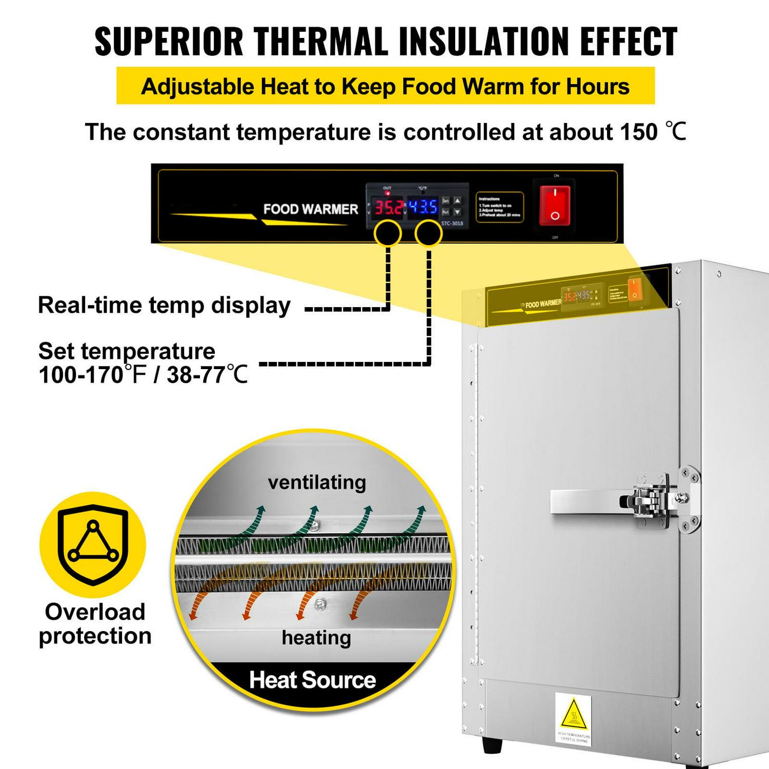 Temperature control for adjusting heating temperature from 100 to 170°F; thermostatic mode keeps the food at 150°F constantly and the internal PTC heat source can avoid over-heating, perfect for commercial catering use.