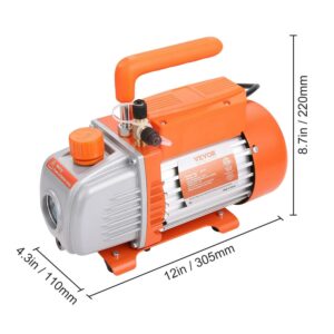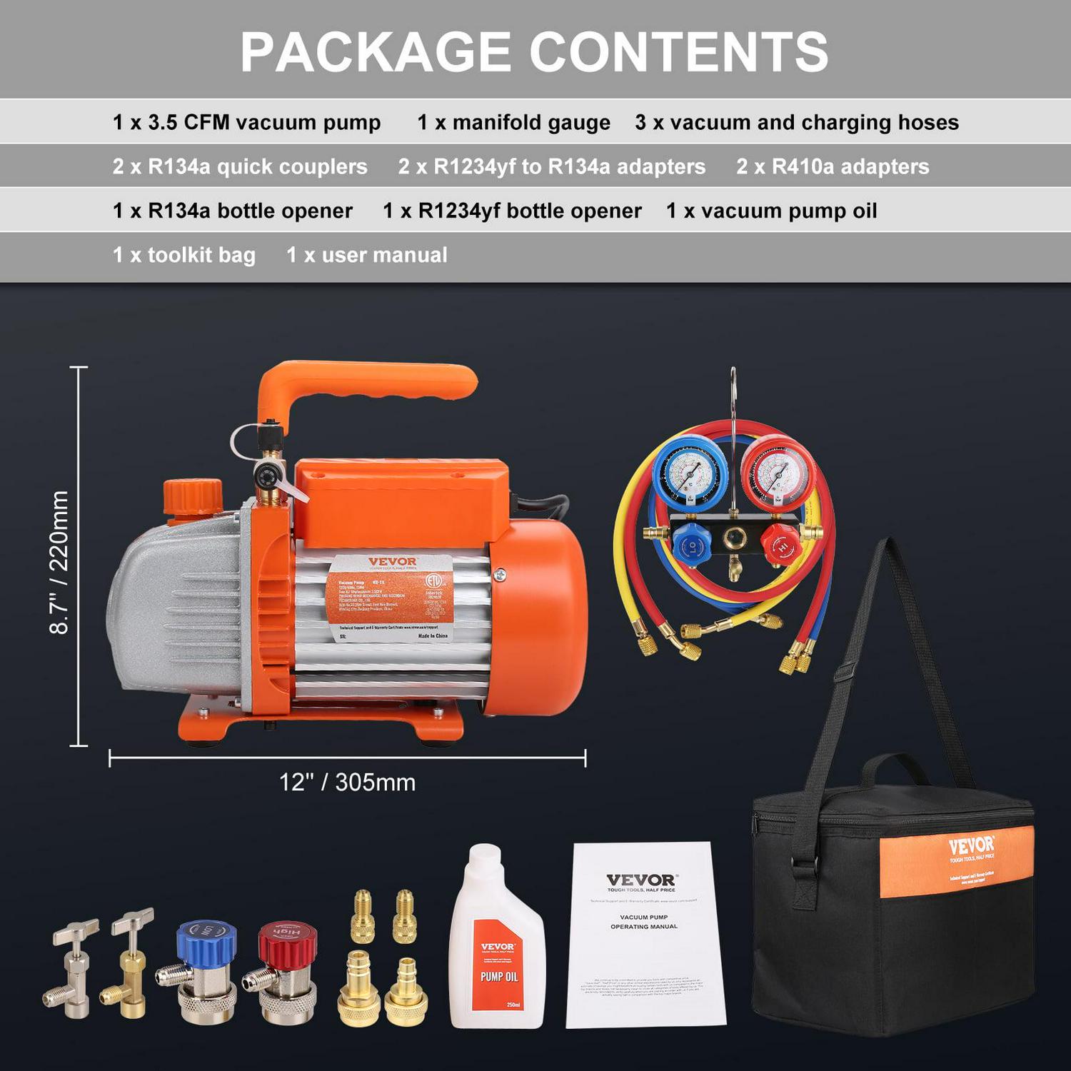 – High-Performance Vacuum Pump: Single-stage pump is designed for a higher and more stable ultimate vacuum. It passes A2L explosion-proof test for reliable performance and efficient operation and maintains the air conditioning system. Free Air Displacement: 3.5 CFM, Ultimate Vacuum: 40 microns, Intake Fitting: 1/4″SAE male and 1/2″ACME male, Speed: 1720PRM, Voltage/Frequency: 120V/60 Hz, Power: 150W, Oil Capacity: 250 ml.