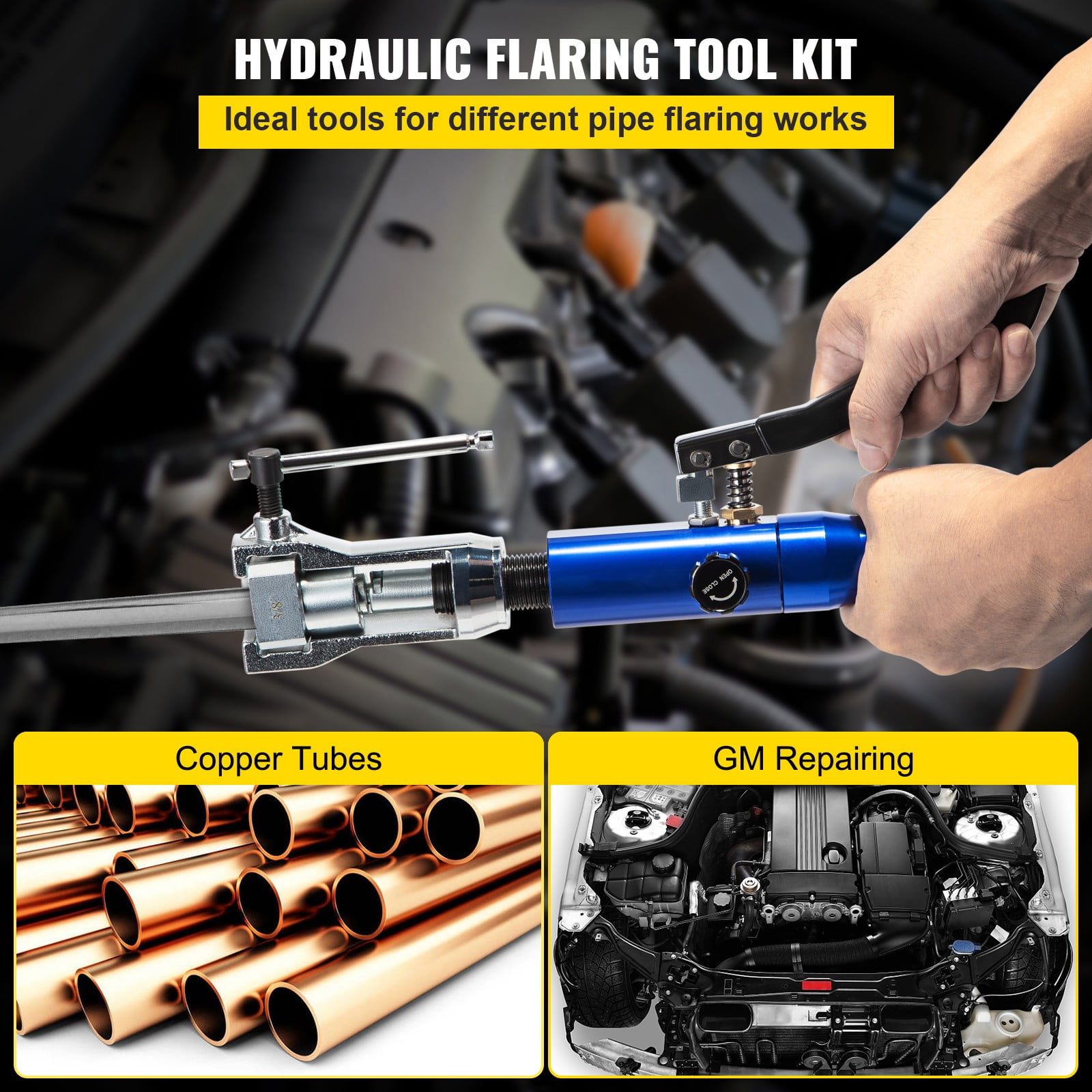 Tube Expanding Functions: This hydraulic flaring tool is equipped with a 45° flaring cone and φ 3/16 – 1/2 inch expanding dies and adapters, including, push connects, GM fuel lines, GM transmission cooling line, 45° and double flares, ISO bubble flares. Pipe Cutting & Deburring: The double flaring tool comes with a mini pipe cutter and deburrer, which can help to flare pipe. The cutter cuts tubes ranging from 1/8″ -5/8″ quickly with a solid and sharp blade. The deburring tool is used for cleaning the interior and exterior of tubing. Durability & Portability: The flaring tool is durable 40 CR steel, which is reliable and built to last. Besides, the flaring tool kit is stored in a plastic toolbox, reducing the possibility of missing parts. It is compact and easy to carry. Wide Application: This hydraulic flaring tool kit is suitable for expanding copper and stainless steel piping. It is an excellent tool for repairs on vehicles or making lines off a vehicle, ideal for the refrigeration and air conditioning industry. Manual Hydraulic Mechanism: This hydraulic flare kit achieves the pipe expanding with a hydraulic mechanism. The hydraulic tool is designed with exquisite details, such as a pressure relief valve and no-leakage oil cylinder. You can easily operate this tool without effort.