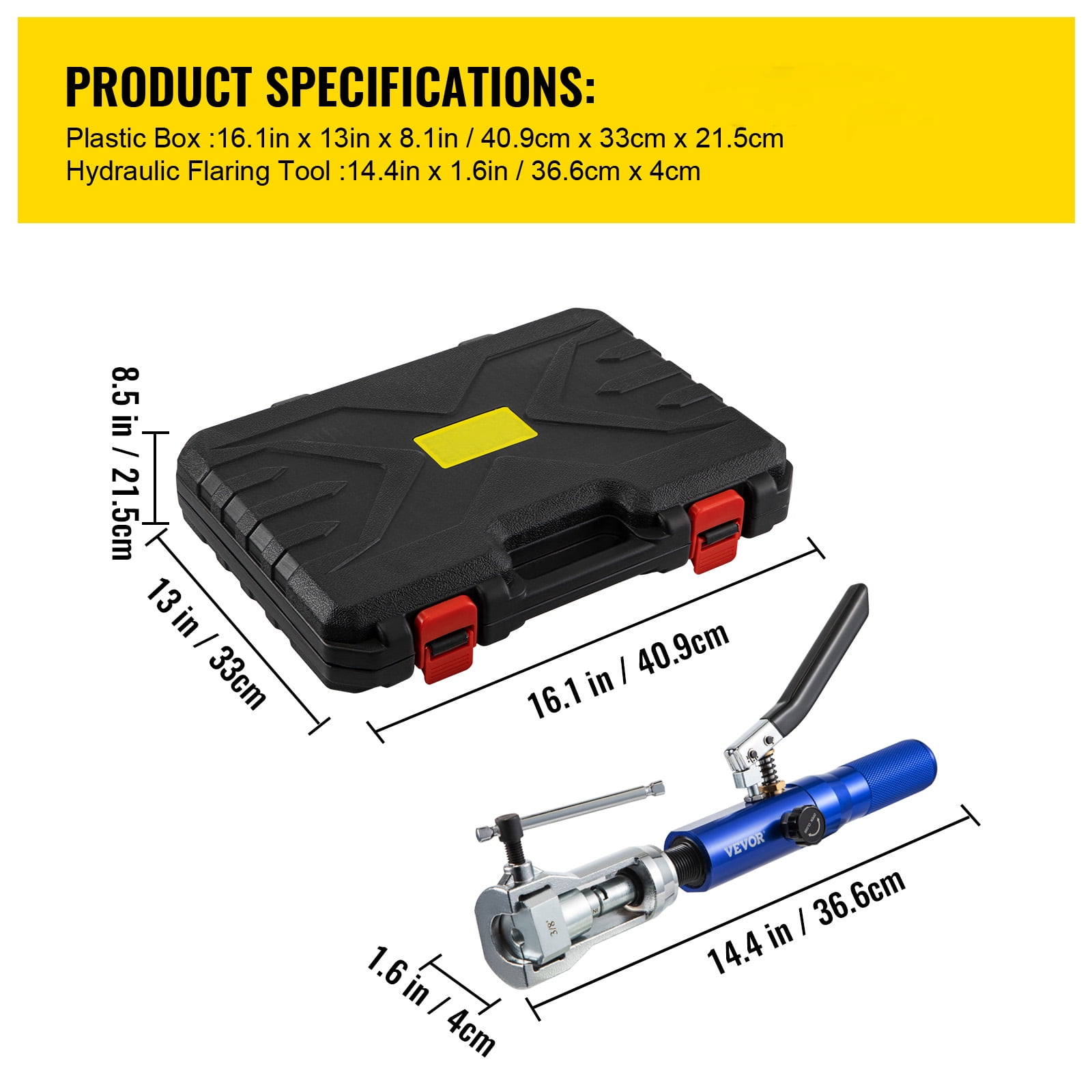 Product Description 45° Hydraulic Flaring Tool Kit The superior brake repair brake flaring tools with pipe flaring functions are compatible with a single die. The tool is equipped with different types of dies. Our brake flare tool carries many advantages of ergonomic design, easy operation, and high efficiency. The hydraulic mechanism makes flaring a breeze. It is an ideal tool to be used in GM repairing and HAVC piping.The double flare tool kit is applicable for soft copper tubes, stainless steel tubes, or other soft metal tubes widely used in vehicle repairs, HAVC piping. Specifications Material: 40 CR Steel Flaring Cone: 45° Push Connect Die Size: 1/4″, 5/16″, 3/8″ GM Fuel Line Die Size: 5/16″, 3/8″ GM Transmission Cooling Line Die Size: 3/8″, 1/2″ 45° and Double Flare Die Size: 3/16″, 1/4″, 5/16″, 3/8″, 1/2″ ISO Bubble Flare Die Size:4.75 mm, 6 mm, 8 mm, 10 mm (0.19/0.24/0.31/0.39 inch) Package Content 1 x Hydraulic Flaring Tool 1 x 45° Flaring Cone 16 x Dies 16 x Adapters 1 x Deburring Tool 1 x Cutter