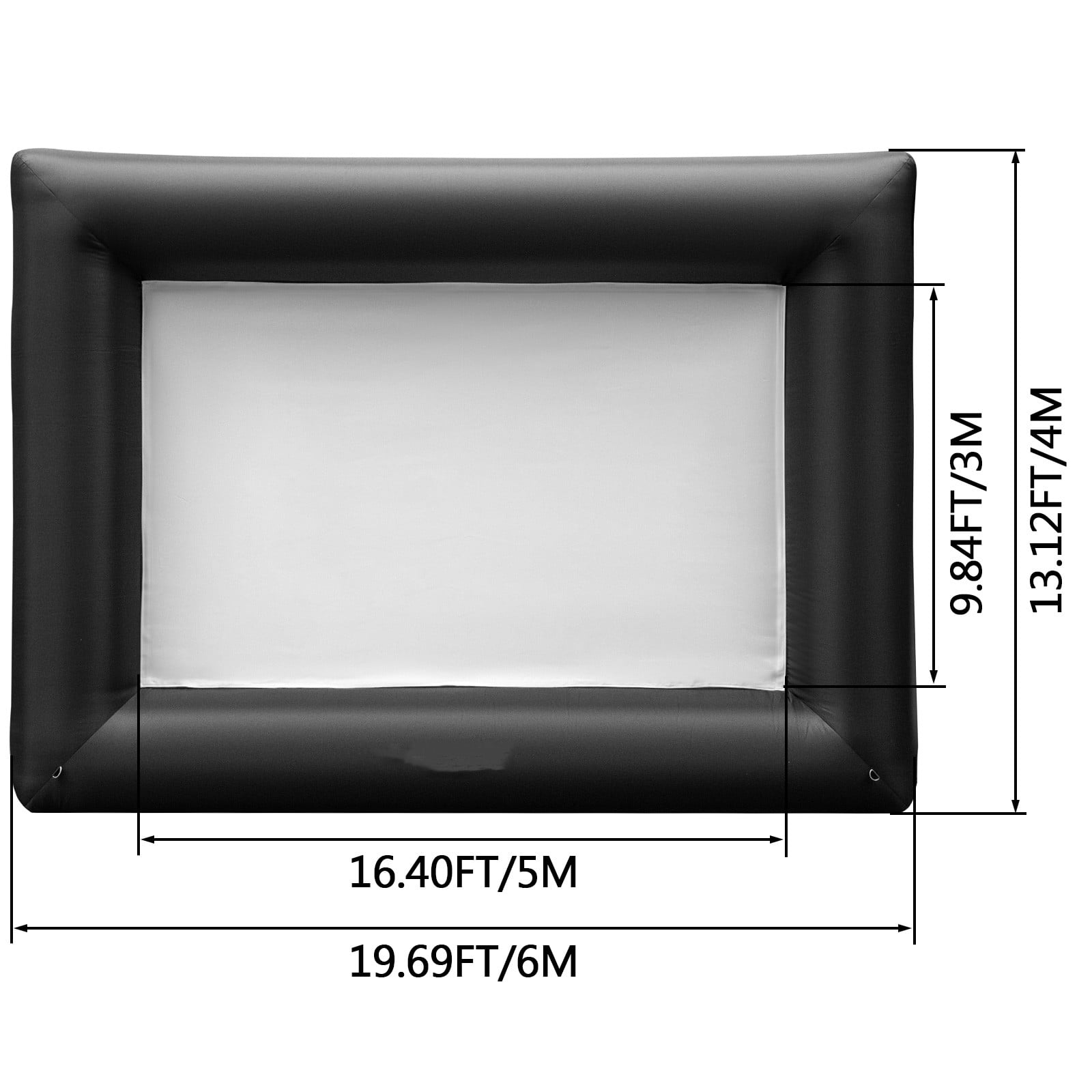 Product Description 24FT Inflatable Projector Screen Our movie screen is designed to help you get more fun at home parties and outdoor BBQ. Self-blow quickly within 2 minutes when plugged in. It can create a full-size widescreen that displays favorite movies, TV shows, videos, or playing games. A happy atmosphere can be made, while friends, kids, colleagues, or neighbors will have a good time. Specifications Material: Oxford Fabric Color: Black & White Screen Size (L*W): 16.4 x 9.84 ft/5 x 3 m Overall Size (L*W): 19.69 x 13.12 ft/6 x 4 m Blower Power: 360W Voltage: 110V/60HZ Package Content 1 x Inflatable Movie Screen 1 x Air Blower 1 x Fixation Rope Kit 1 x Bag