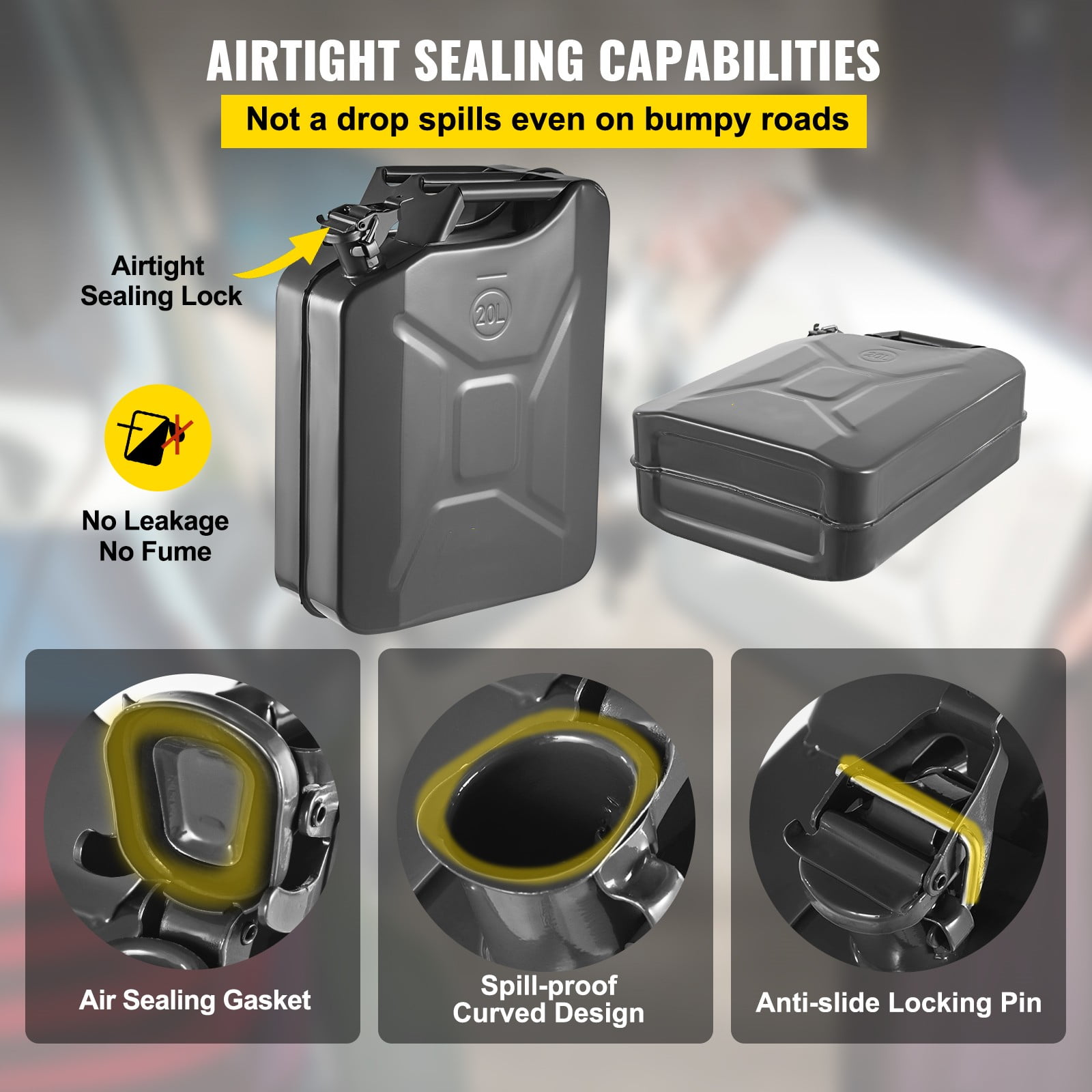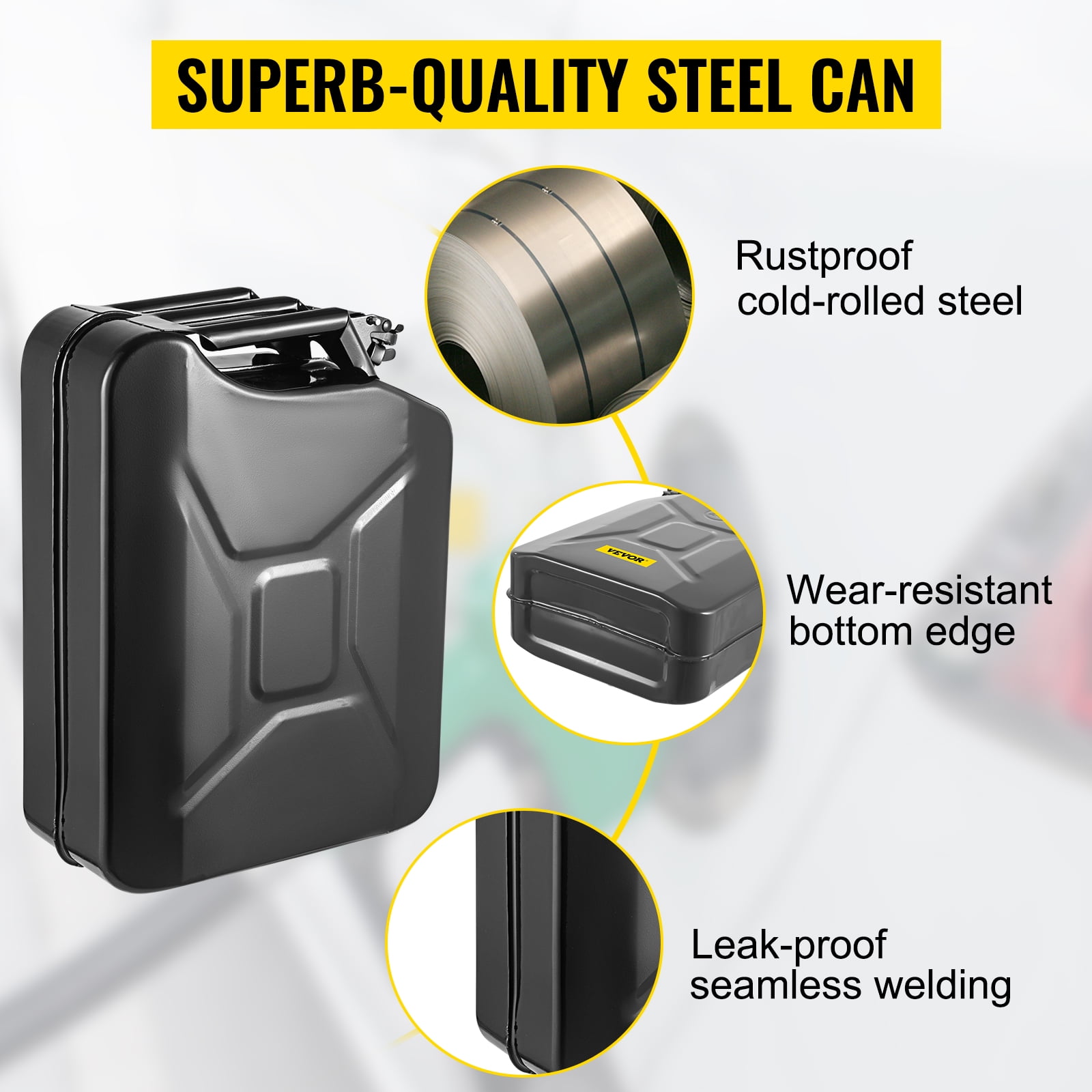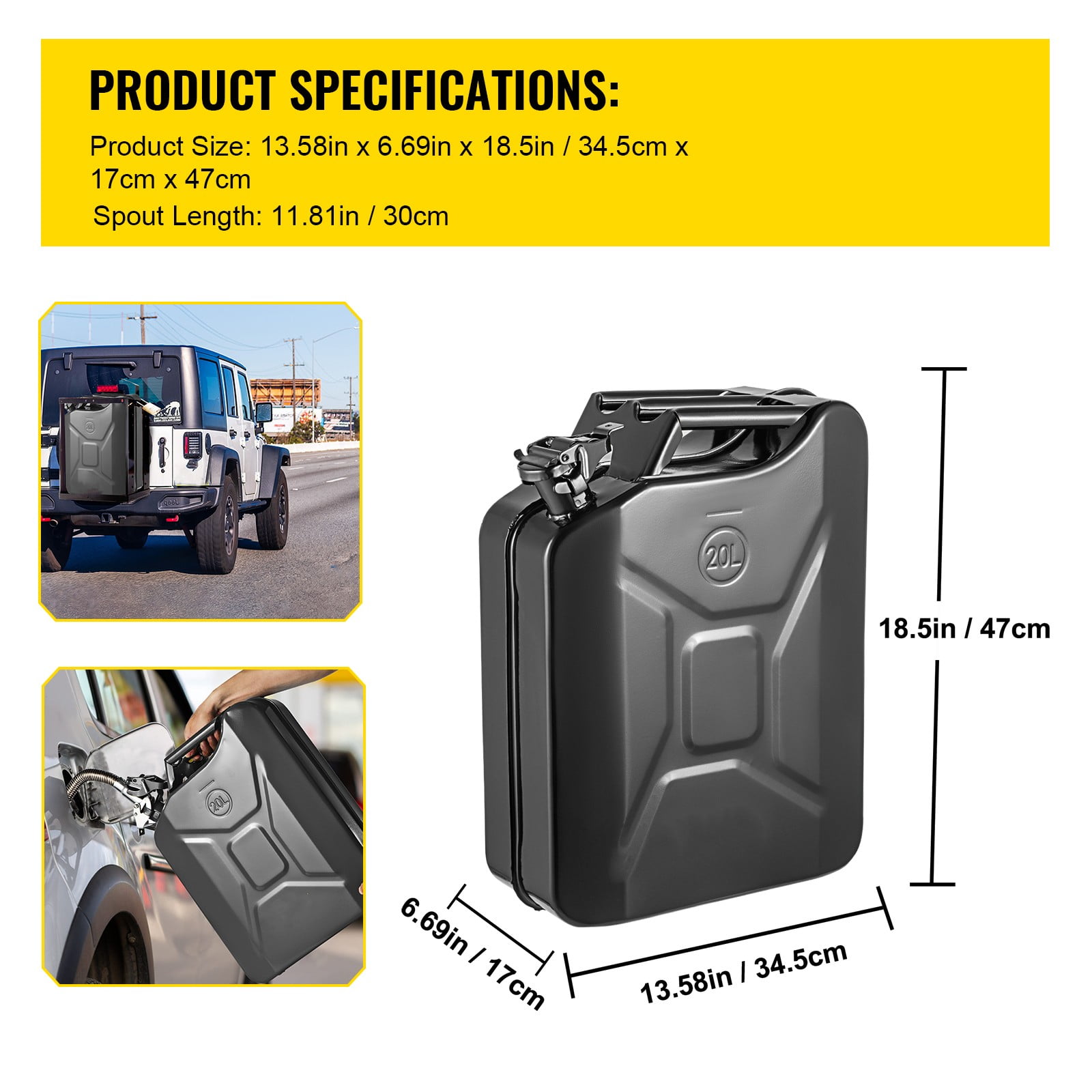 Product Description VEVOR Jerry Fuel Can Our first-rate steel jerry cans are more durable and safer when compared to plastic fuel cans. The 5.3-gallon tank is large enough for storing sufficient fuel as a reserve, and the spout system allows for fast refueling. Stop worrying about running out of fuel while traveling to distant places. Stop thinking about where you can’t go, since you are now prepared for everything. 5.3 Gal Jerry Can With a 5.3 gal / 20L large capacity, our jerry can is capable of storing sufficient reserve fuel for you to reach your final destination. Put the oil tank in your vehicle, and stop worrying about your fuel gauge while on long road trips. Superb-quality Steel Can Plastic fuel tanks are fragile and can be easily pierced or broken accidentally, thus leaving the oil out in the open. So we abandoned cheap plastic and adopted heavy-duty rustproof steel for the main structure to ensure much safer & longer use. Airtight Sealing Lock The oil mouth of our jerry can is sealed tightly by a unique cap that prevents air from escaping; further secured by a locking pin that prevents unwanted opening. When you are in need, just manually remove the pin, and open the cap easily. Improved Flexible Spout We provide an additional spout that allows gasoline to be poured smoothly inside the tank and prevents spilling. Use our jerry can to refuel your vehicle quickly and continue your unforgettable trip. Easy Carrying & Storage The size of the fuel can is 13.6″ x 6.7″ x 18.5″ (L x W x H), and this flat cuboid shape won’t take much space. The three handles make it effortless to carry and allow two people to lift for refueling. Wide Application Given its top-quality material and large capacity, this steel fuel tank can be used to store gasoline, diesel oil, water, and many other kinds of liquid. It is a perfect reserve fuel can for you to put in your vehicle and fill up anytime, anywhere. Specifications Model: 1X20LBLACK Style: Military Material: 0.8 mm Cold-rolled Steel Capacity: 5.3 US Gallons / 20 L Color: Black Quantity: 1 Weight: 9.83 lbs / 4.46 kg Spout Length: 11.8 in / 300 mm Spout Diameter: 0.79 in / 20 mm Package Content 1 x 20L Black Jerry Can 1 x Flexible Spout