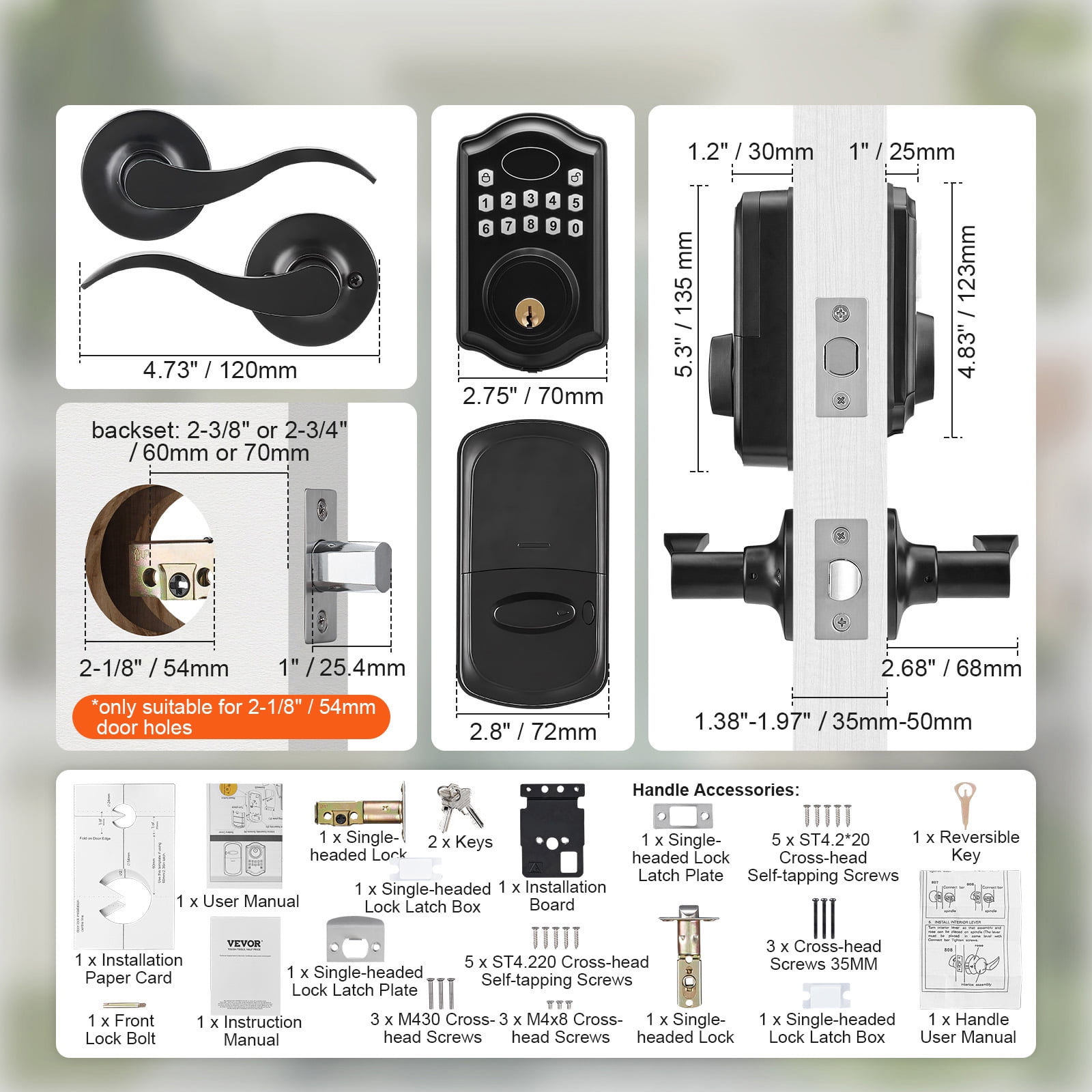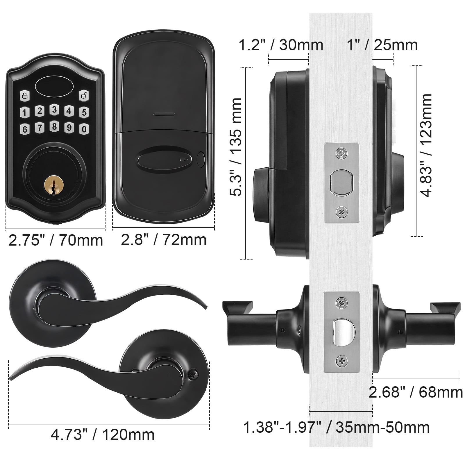 Unlock Your Way: Say goodbye to traditional locks! Our keyless entry door lock provides two unlocking methods – you can choose between a password or a key for access. You can even set up to 300 unique passcodes for family and friends. Exceptional Weather Resistance: Come rain or shine, our electronic door lock stands strong. The aluminum alloy panel ensures durability in temperatures ranging from -22°F to 158°F (-30~70℃), while its IP63 waterproof rating allows it to function flawlessly in any weather. It’s sunproof, waterproof, and freeze-resistant, suitable for both indoor and outdoor use, providing reliable home security. One-time Password & Anti-Peeping Code: We’ve taken password protection to the next level. One-time passwords provide convenience for temporary guests, automatically clearing after use for enhanced security and efficiency. The anti-peeping virtual code safeguards your privacy – you can input any digits before and after the correct password as long as it contains the correct sequence, effectively preventing peeping. Easy Breezy Access: Set your keypad door lock to auto-lock in 5-69 seconds – no more wondering if you locked the door, making it perfect for homes with seniors and children. Simply press the lock button for quick manual locking. Got a party? Frequent comings and goings? We’ve got you. Flip the “Constant Open” switch, and the door won’t lock automatically. Super flexible! High Compatibility: Our keyless door lock with handle is fully compatible with all American standard doors. The handle can be adjusted for left or right-hand orientation, enhancing both security and convenience for your home.
