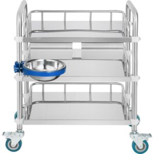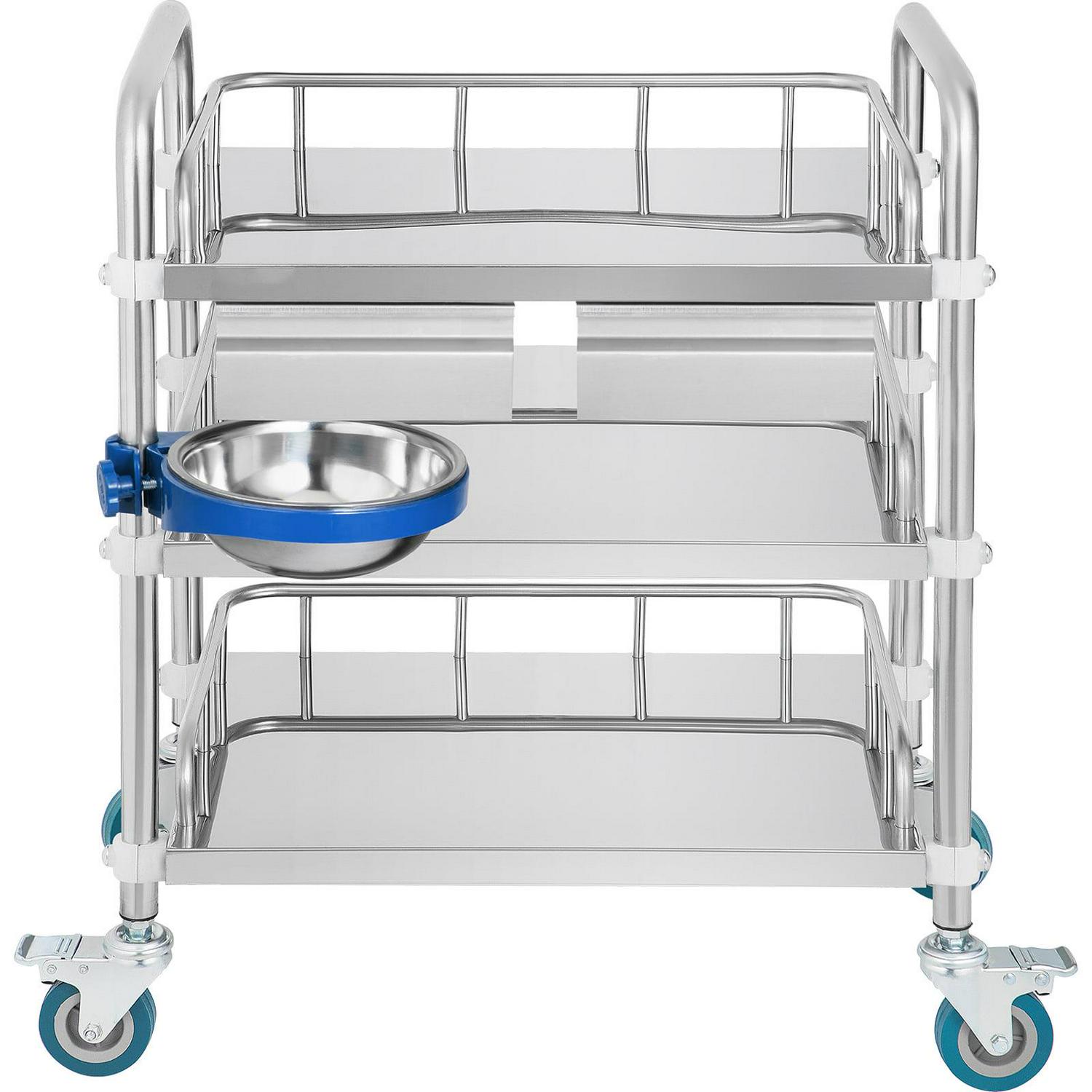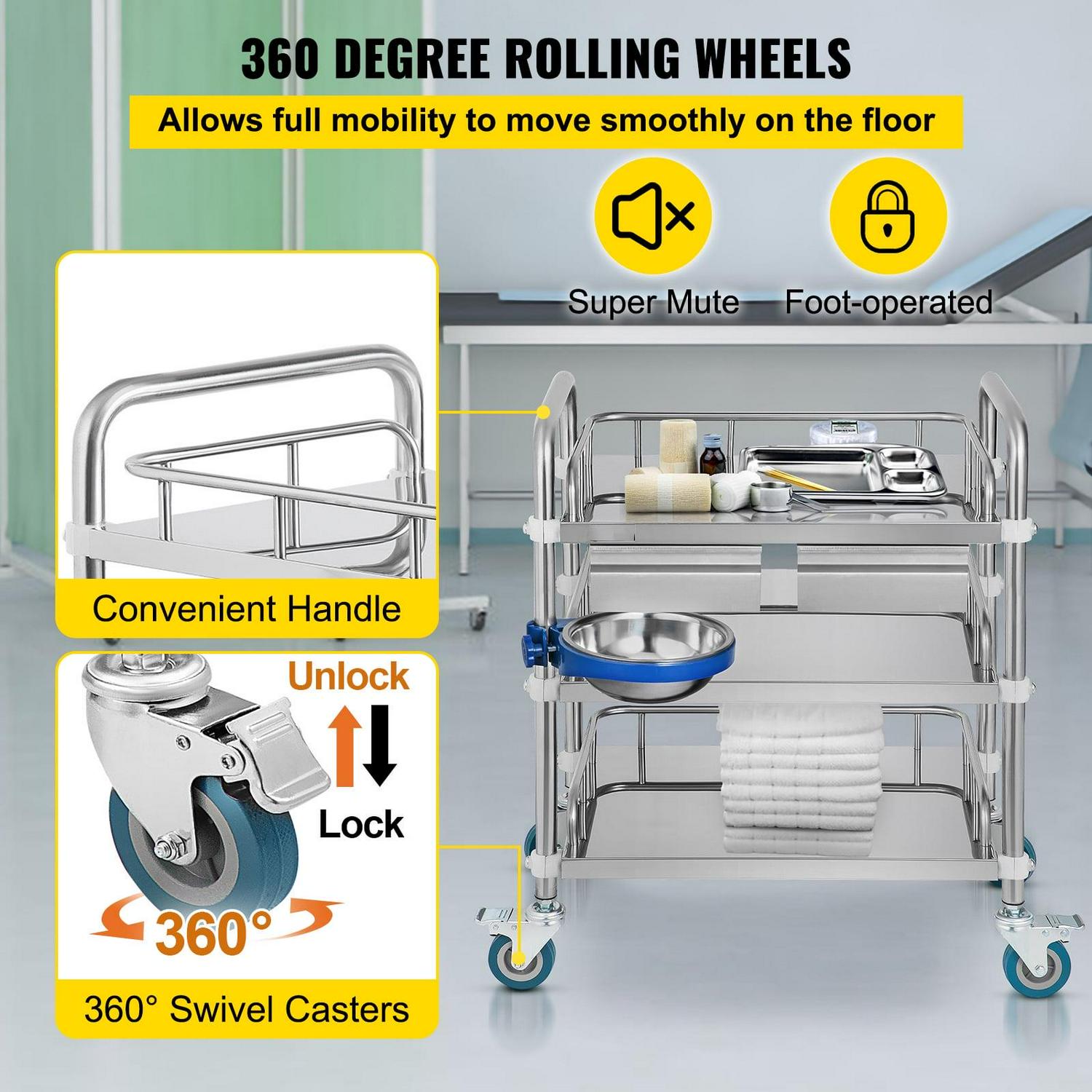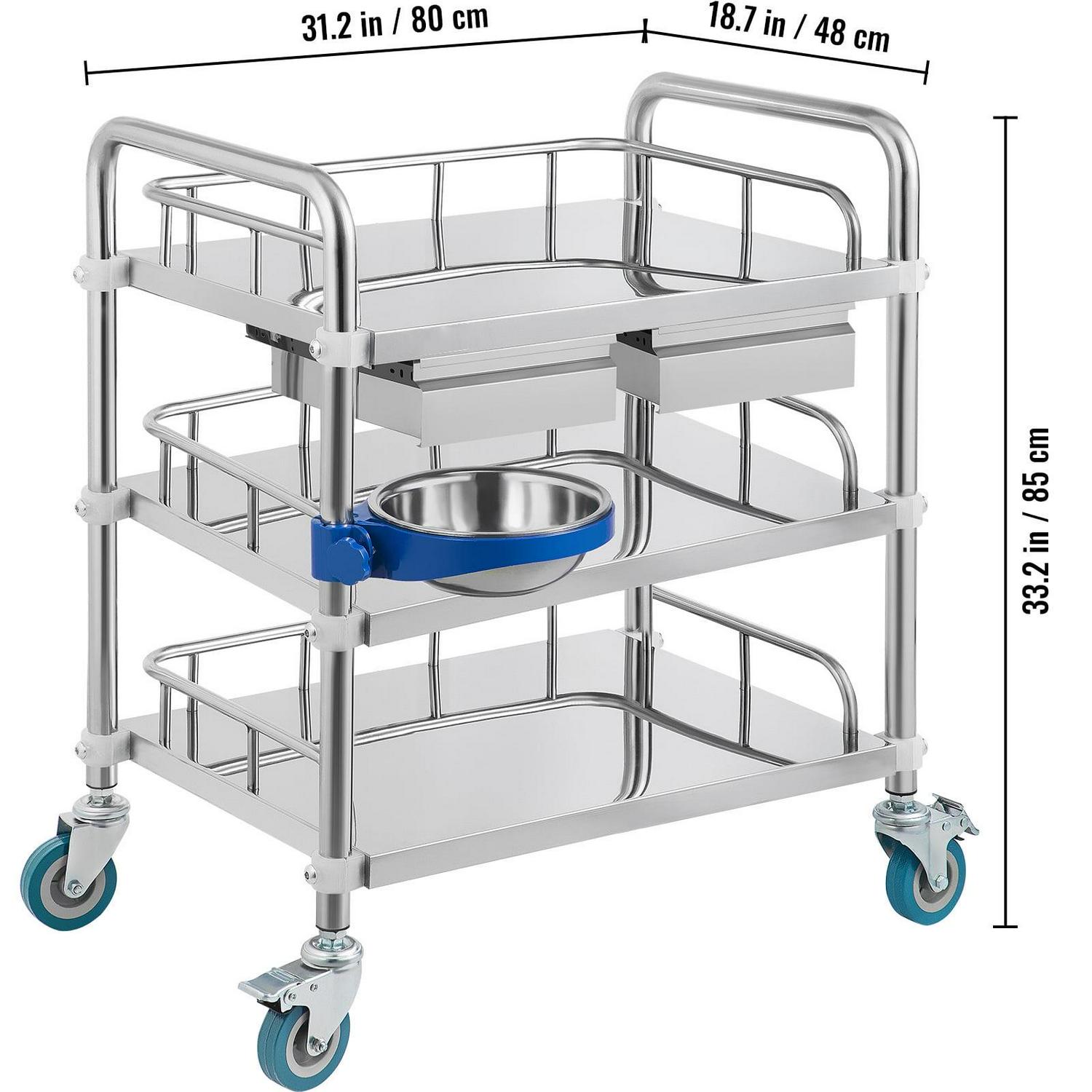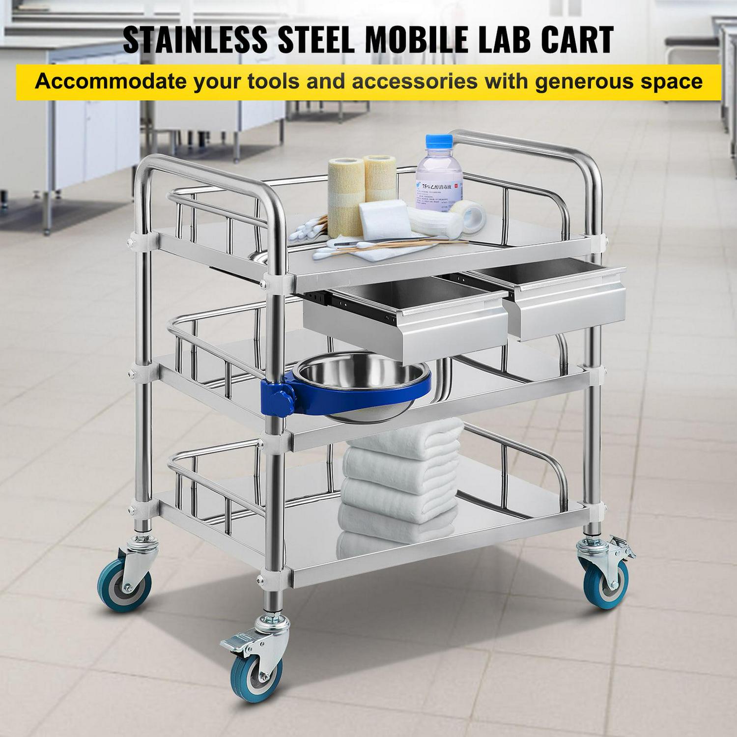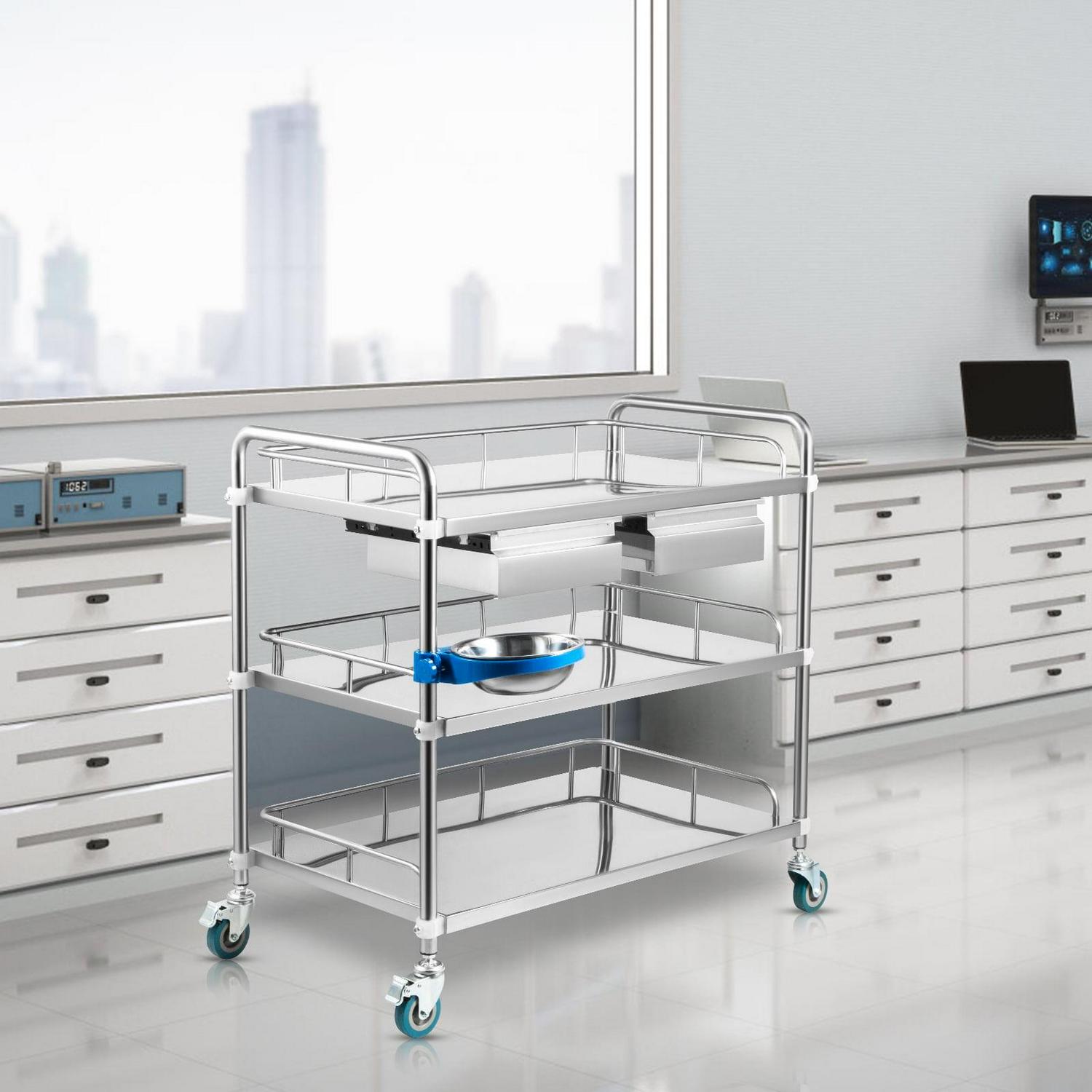 3-layer lab cart is fabricated with superior quality 304 stainless steel with better resistance to corrosion and rust. The pushrod is comfortable to grab, and the guardrails permit secure transport. Designed with one refuse basin, two easy-to-pull drawers, and four lockable universal wheels, this functional cart is ideal for any condition when you need transportation.