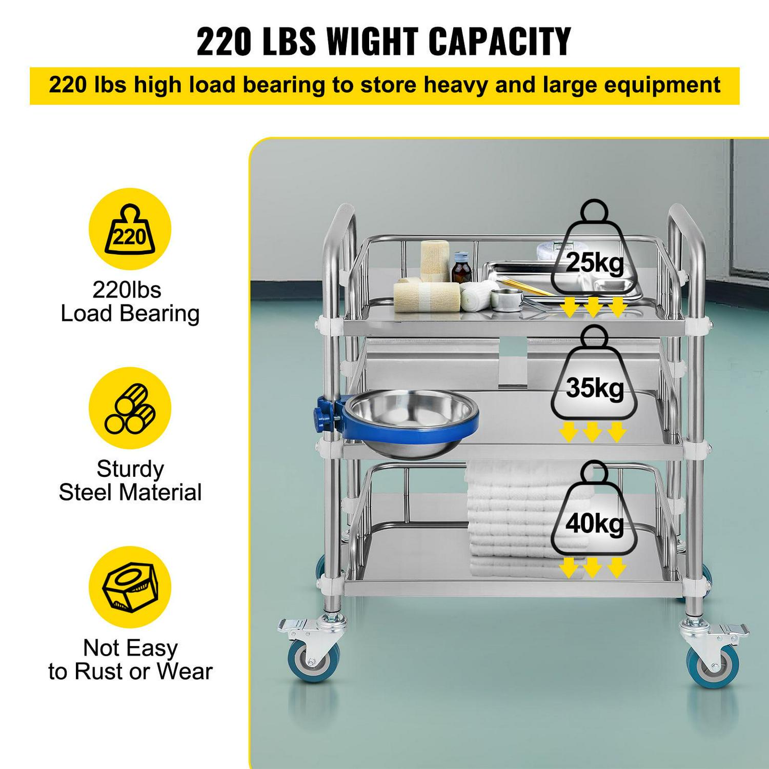 – 3-Layer Cart: This cart features three layers, and you will have extra storage space to array your lab items. The load-bearing of this cart also performs well – which can support 220 lbs.