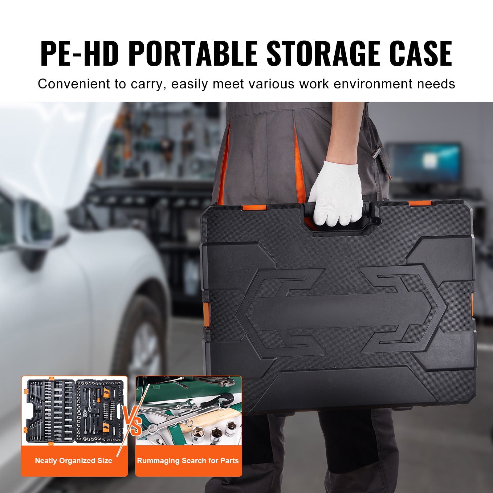 Built to Last: Our mechanics tool set is mainly made of CR-V chrome plating to ensure resistance to rust and wear, maintaining its quality even during extended usage. Whether for household repairs or professional tasks, it is reliable. Rigorously tested premium materials ensure exceptional durability and longevity. Tackle various repair and installation tasks with confidence. Diverse Components: This mechanic tool kit is your versatile partner, perfect for car care, DIY adventures, and equipment tinkering. With a range of socket sizes, you’ll conquer various tasks effortlessly. Robust construction and precision design ensure stability and reliability. Withstand 141 to 5073 in-lb High Torque: Our tool set takes on challenges from dismantling tight nuts to installing machinery. A meticulously designed torque delivery design ensures reliability and stability, boosting your confidence on challenging projects. Trust in quality materials and a rugged build – it’s your choice for the pro or DIY enthusiast. Attachments for the Win: Our socket set comes with complete accessories, meeting most of your usage needs. Effortless manual installation ensures efficient work experience. PE-HD Portable Storage Case: This tool set mechanics kit features a lightweight and portable design for easy carrying and storage. Neat compartments ensure you always grab the right piece for the job. No more hunting, just a toolbox that gets you right into the action, wherever you are.