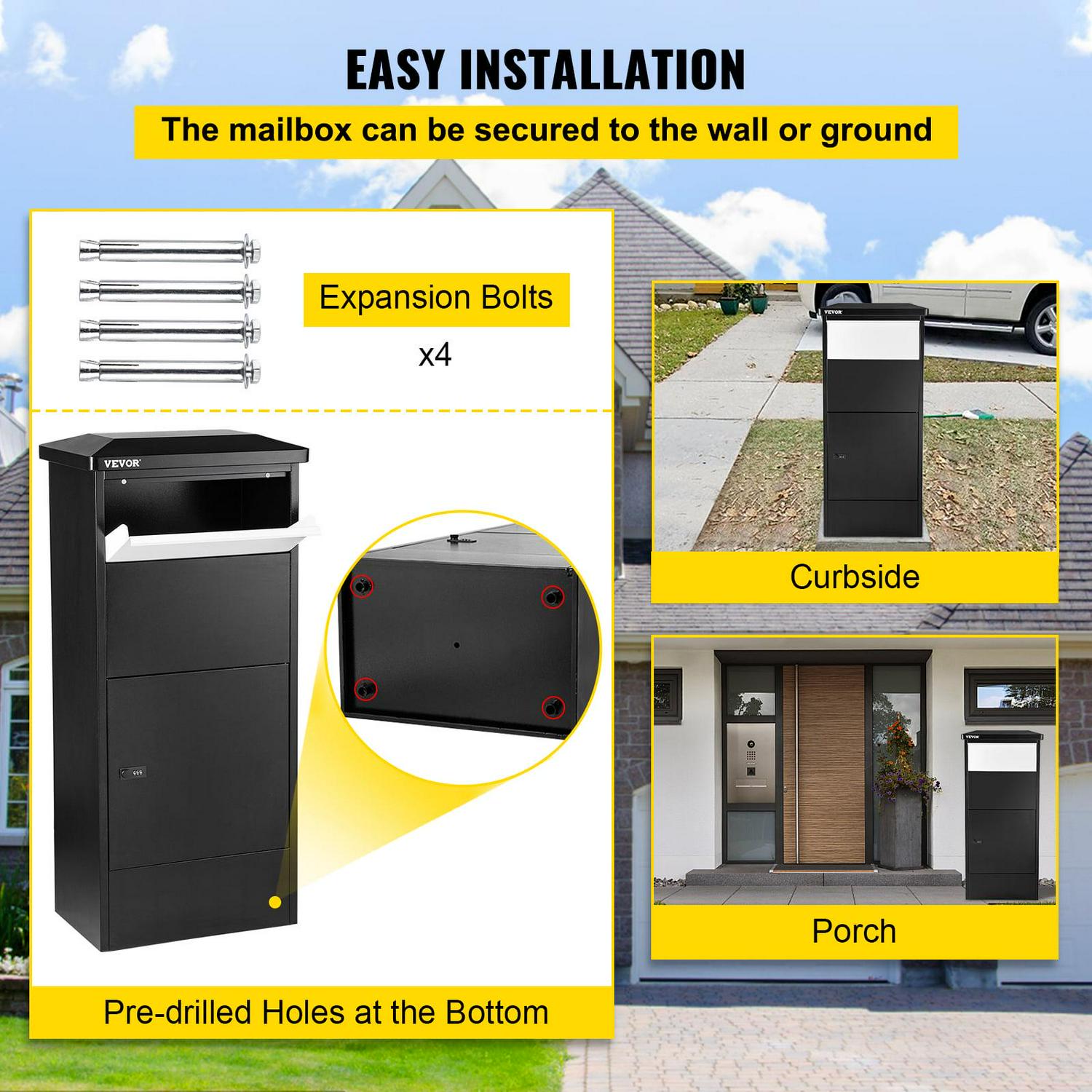 – Wide Applications: The package delivery box can be installed at the porch, yard, or curbside to receive various couriers.