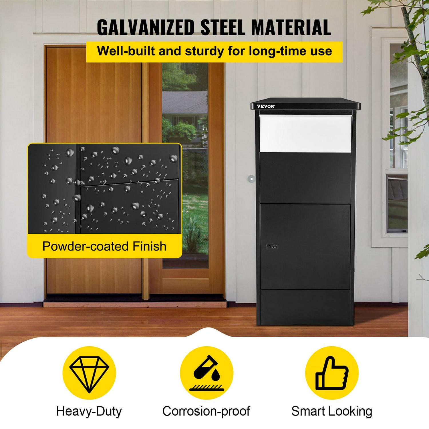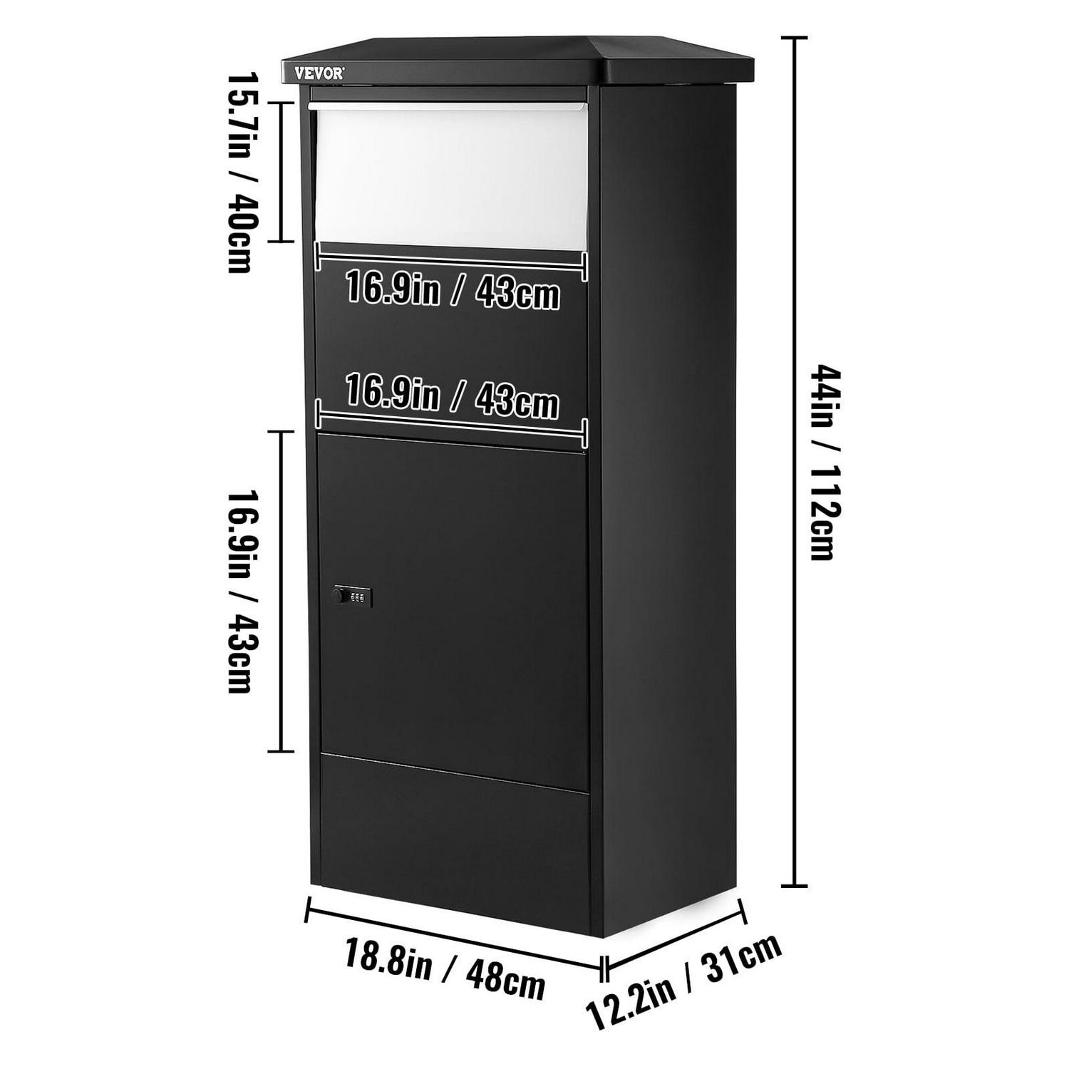 Galvanized Steel Construction & Code Lock & Rainproof The total size of the package delivery box is 18.9 x 12 x 44 inches, which is spacious enough to accommodate a considerable amount of medium and large parcels.The package parcel box is manufactured with galvanized steel with a powder-coated finish, sturdy and rustproof for long-time use.The parcel drop box features a code lock to strengthen its security. You do not worry about keys being lost anymore. The flap drop slot can block others from stealing parcels.