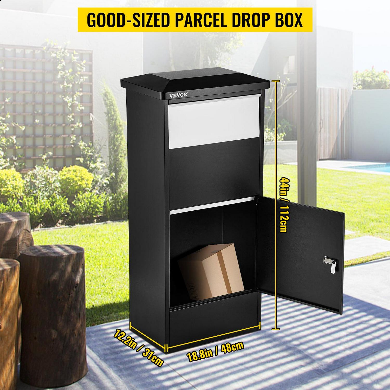 – Premium Package Delivery Box: The parcel drop box is made of galvanized steel, sturdy, modern, and corrosion-proof. Total Dimension: 18.9” x 12” x 44”. It is used for receiving various packages in your daily life.