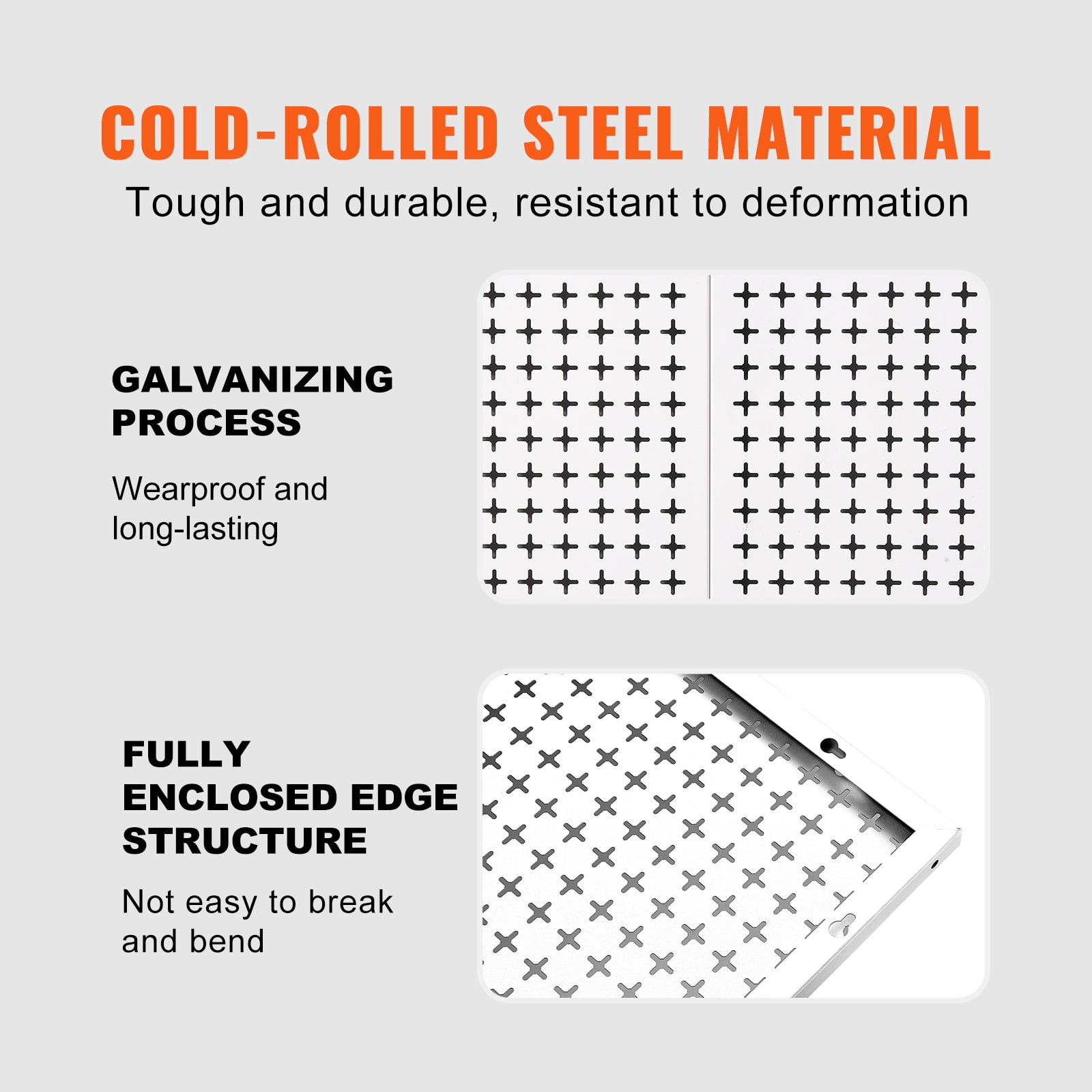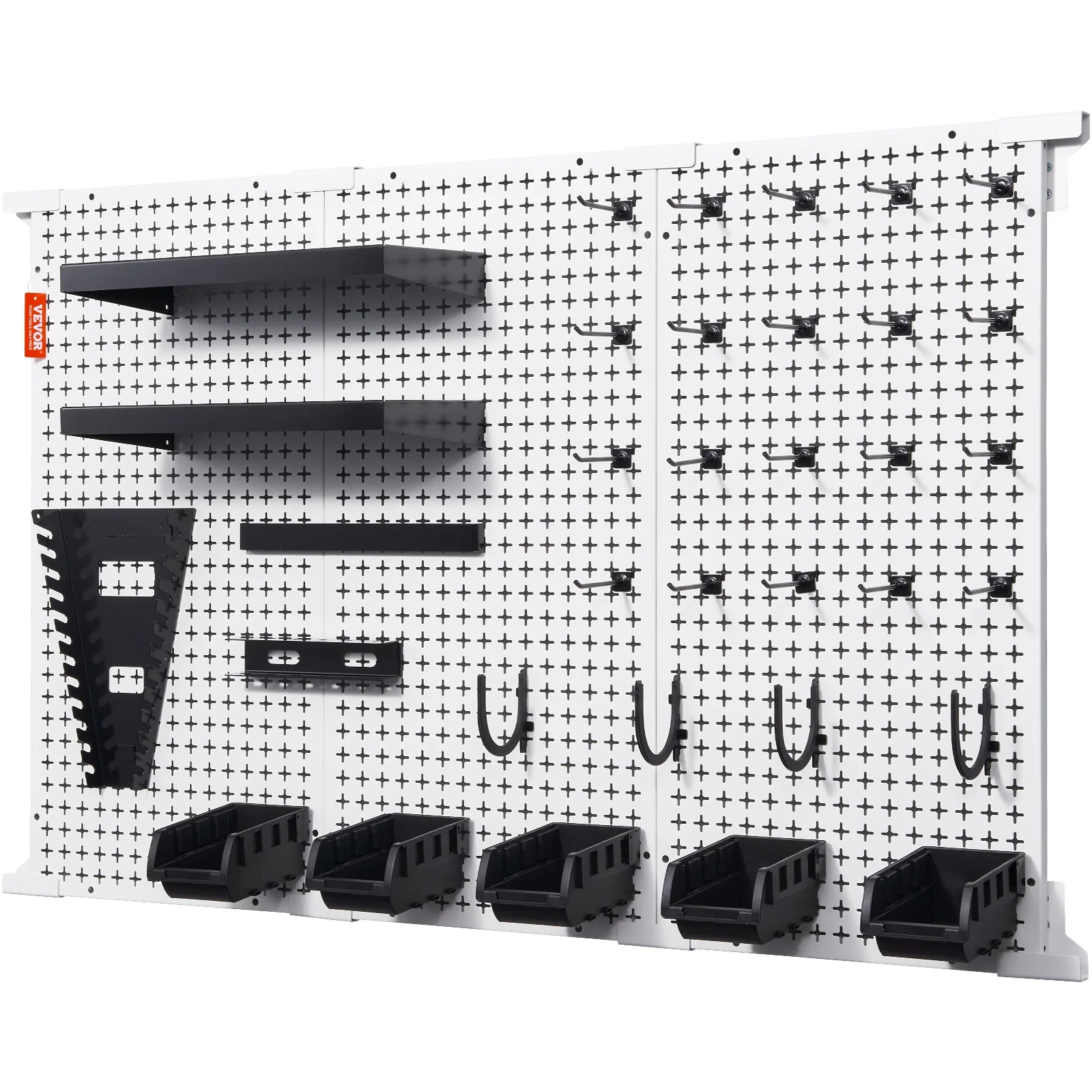 Product Description Pegboard Wall Organizer Takes the clutter off your workspace with BENTISM pegboard wall organizer. 495lbs weight capacity, 48″ x 32″ large tool board and diverse organizational accessories can hang heavy loads and store more tools with ease. Hang your hammers, power drills, ladders, handsaws, and more with stability, without any wobbling or shifting. Take it to your garages, hardware stores, workshops, gardens, and more. Robust Structure Crafted with a cold-rolled galvanized steel, our quality garage pegboard organizer is robust and durable for efficient storage and organization. Large Storage Size Whether you’re looking to reorganize your garage, hardware store, workshop, or garden tools, our 48″ x 32″ metal garage tool organizer is your ideal choice. Well-Crafted Details Its fully enclosed edge structure ensures enhanced stability of the pegboard, much resistant to breakage, corrosion and deformation. Dual-directional Grooves Ensure a perfect fit for various hooks, providing stability without loosening. Flexible Installation Additionally, the hooks can be installed horizontally or vertically, offering flexible options for versatile hanging. Easy Operation The assistance of installation blocks make installation effortless and straightforward. Specifications Item Model Number: HB9632 Overall Product Dimensions: 48″x 32″/ 1219mm x 814mm Each Peg Board Dimensions: 32″x 16″/ 814mm x 407mm Loading Capacity: 495 lbs Material: Cold-rolled Steel, Galvanized Surface Net Weight: 33.5 lbs / 15.2 kg Hole Diameter: 1/4 inch Hole Spacing: 1 inch Package Content 3 x Tool Peg Boards 20 x Customized Hooks 5 x Storage Bins and Brackets 1 x Screwdriver Rack 1 x Hanging Bracket 2 x Shelf Boards 4 x Rubber U-shaped Hooks 1 x Wrench Rack 8 x Installation Blocks 1 x Positioning Cardboard 1 x Set of Assembly Hardware 1 x Manual Instruction