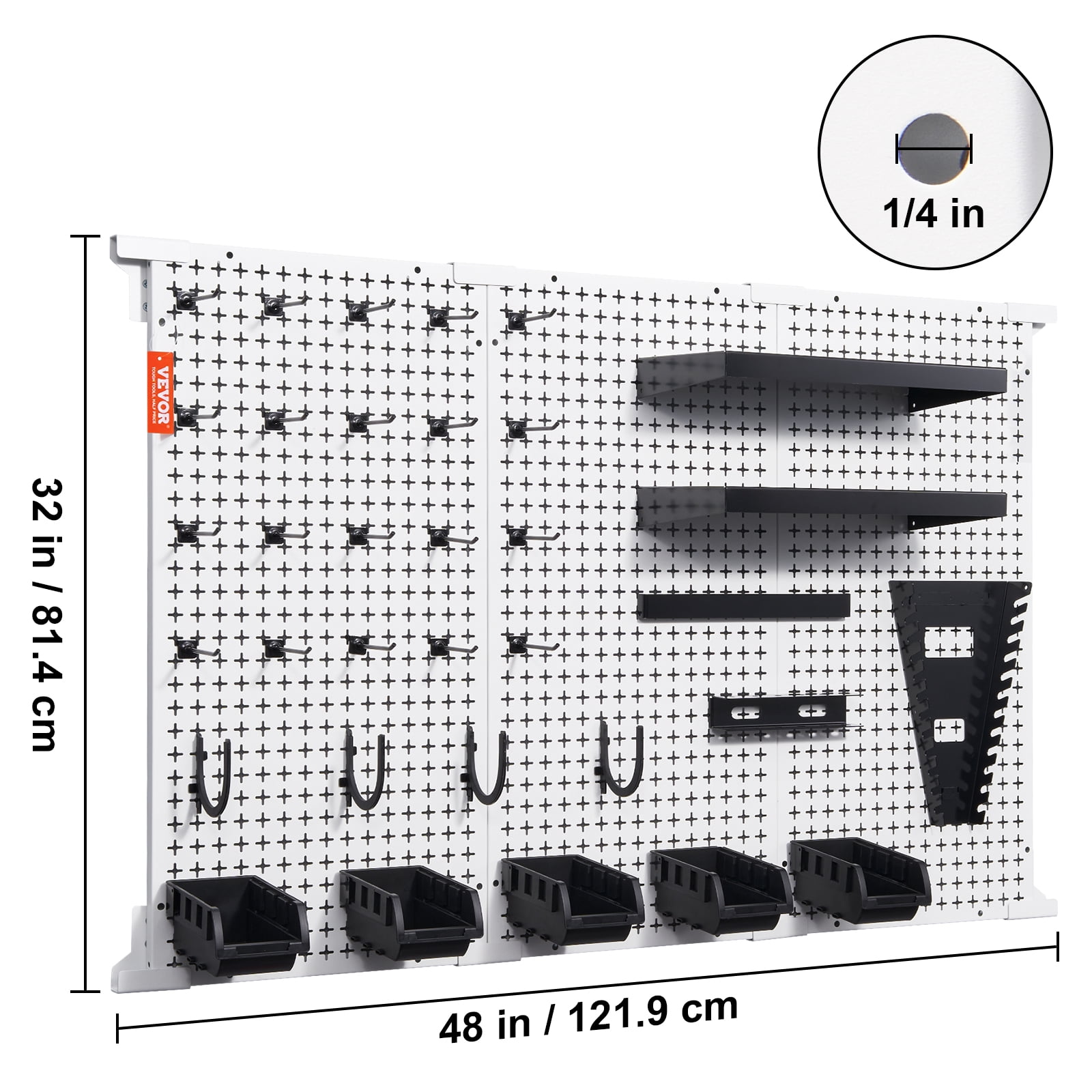 Stable, Durable, Reliable: BENTISM pegboard wall organizer-the ultimate solution for a tidy workspace ! Robust cold-rolled steel garage pegboard tool organizer boasts a zinc coating and a fully enclosed edge structure, resistant to corrosion, breakage, cracking, and built to last. 495 lbs large loading capacity provides reliable support for heavy tools, securely hanging hammers, drills, hand saws, and more without any wobbling. Your Excellent Storage Assistant: 48×32-inch large-sized pegboard for garage provides ample space for organizing screwdrivers, wrenches, pliers, hammers, hardware components, drills, hand saws, adhesive tapes, tissues, lubricants, and more. Perfectly suitable for use in workshops, hardware stores, garages, gardens, and other places. Keep your working tool within arm’s reach and well tidy your space with BENTISM. Secure and Sturdy Hooks Placement: With a standard 1/4-inch hole diameter, this wall mount pegboard organizer accommodates a variety of hooks for secure hanging. Its dual-directional grooves ensure a perfect fit for customized hooks, providing stable support and preventing accidental detachment. Whether you prefer horizontal or vertical hooks installation, this tools organizer permits flexibility to suit your needs. Easy 3-Step Installation: Simplify your assembly process with the installation bar. First, secure the mounting rails onto the wall, then slide the panel into the rail slots, and use the positioning screws to secure it in place. Facilitated by the installation block, only one hole needs to be drilled on the same piece of wood, preventing accidental punctures and ensuring convenient installation. Abundant Accessories: Comes with 3 tool boards, 20 custom hooks, 5 storage bins with holders, 1 screwdriver rack, 1 hanging bracket, 2 shelve boards, 4 rubber U-shaped hooks, 1 wrench rack, 8 installation blocks, 1 positioning cardboard, and 1 set of assembly hardware. Most importantly, all hooks and accessories are not fixed, thus you can change their positions according to the actual needs and DIY pegboard.